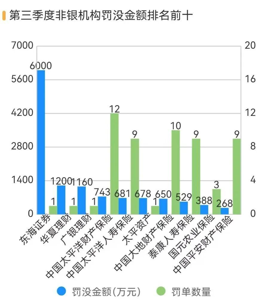 非银机构三季度处罚排名显示,东海证券以6000万元的罚没金额排第一,两家理财公司华夏理财、广银理财分别排第二、第三,罚没金额分别为1200、1159.88万元。保险资管公司太平资产也进入罚没金额前十,罚没金额为678万元。