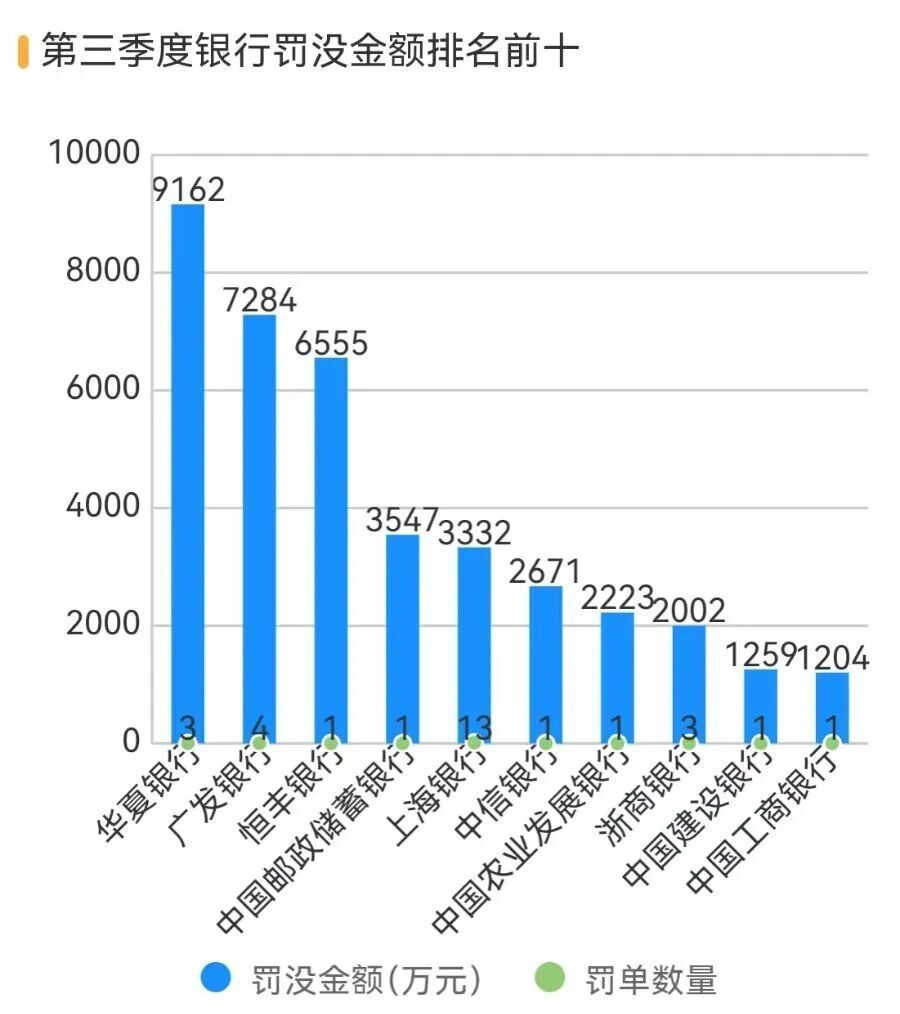 三季度部分股份制银行被罚没的金额居前,华夏银行以9161.93万元的合计罚没金额排第一,广发银行以7284.15万元的合计罚没金额排第二,恒丰银行以6555万元排第三,三家银行均收到超6000万元的大额罚单,因此三季度合计罚没金额居前。