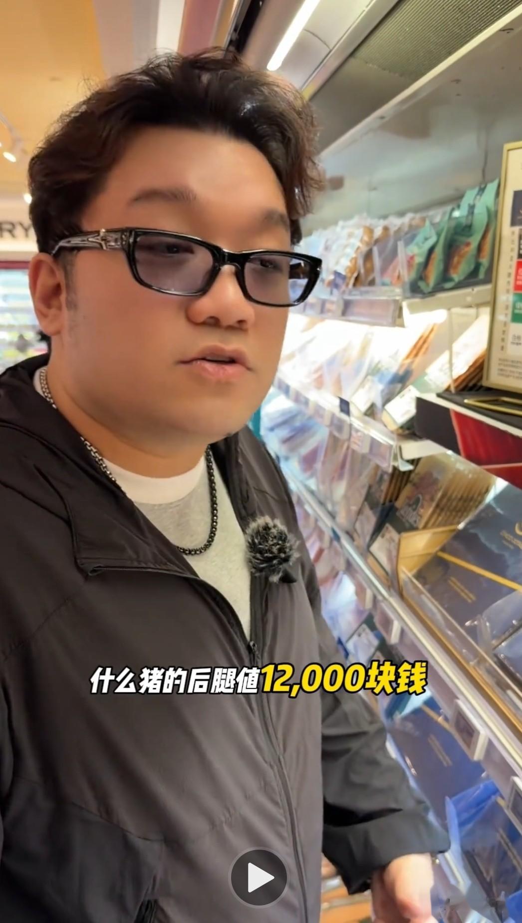 更离谱的还在后面,熟食区一根猪后腿火腿标价11800元,而且还暂时缺货。尤浩然一脸不可思议:什么猪的后腿值12000块钱?还被买走了,这猪得是什么贵族猪啊!