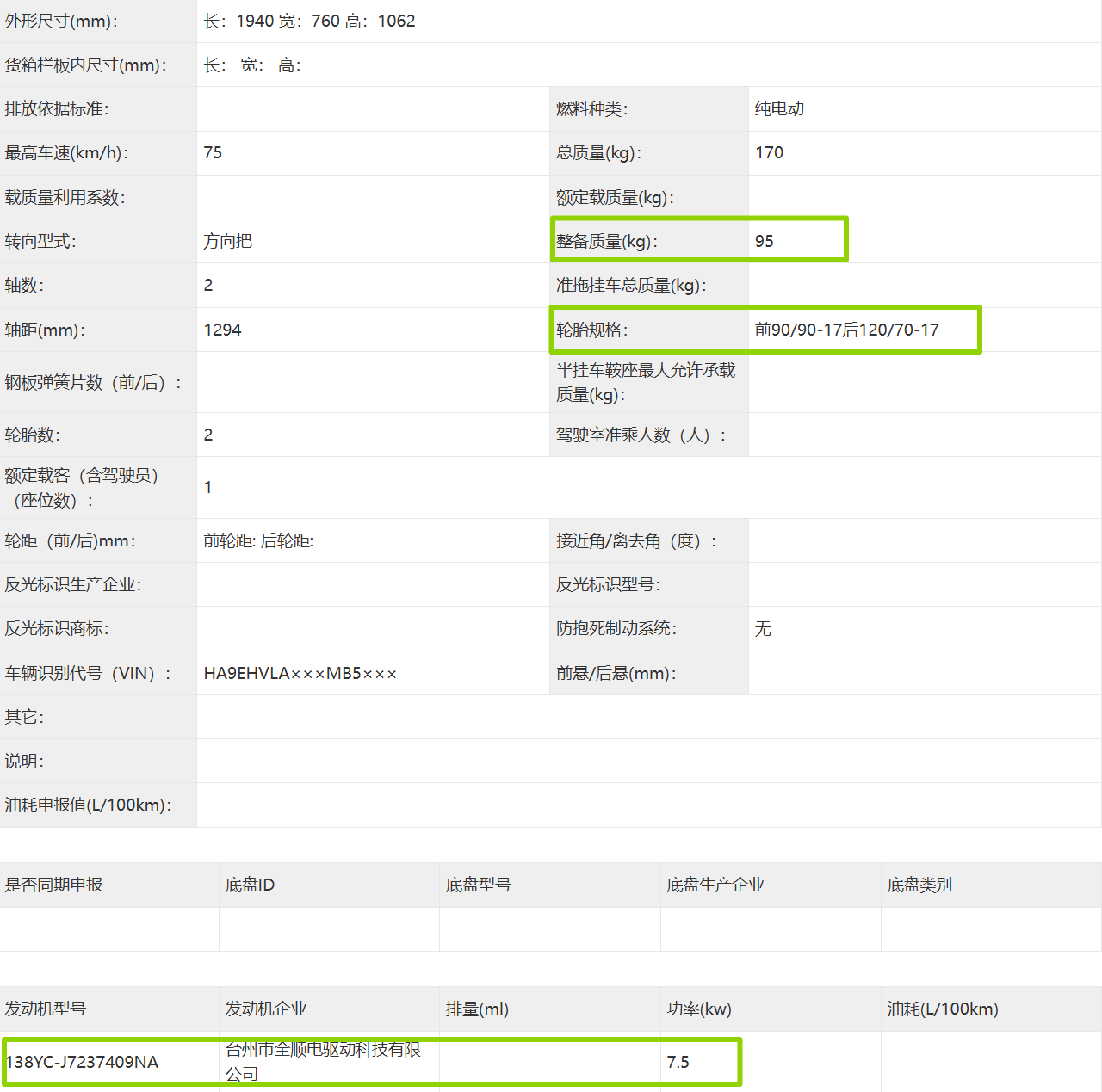 动力方面根据申报参数来看,它搭载一台中置电机,由台州全顺电驱动科技有限公司提供,具备7.5kW的最大功率,极速设定75km/h,至于电池容量方面的信息目前尚不清楚。