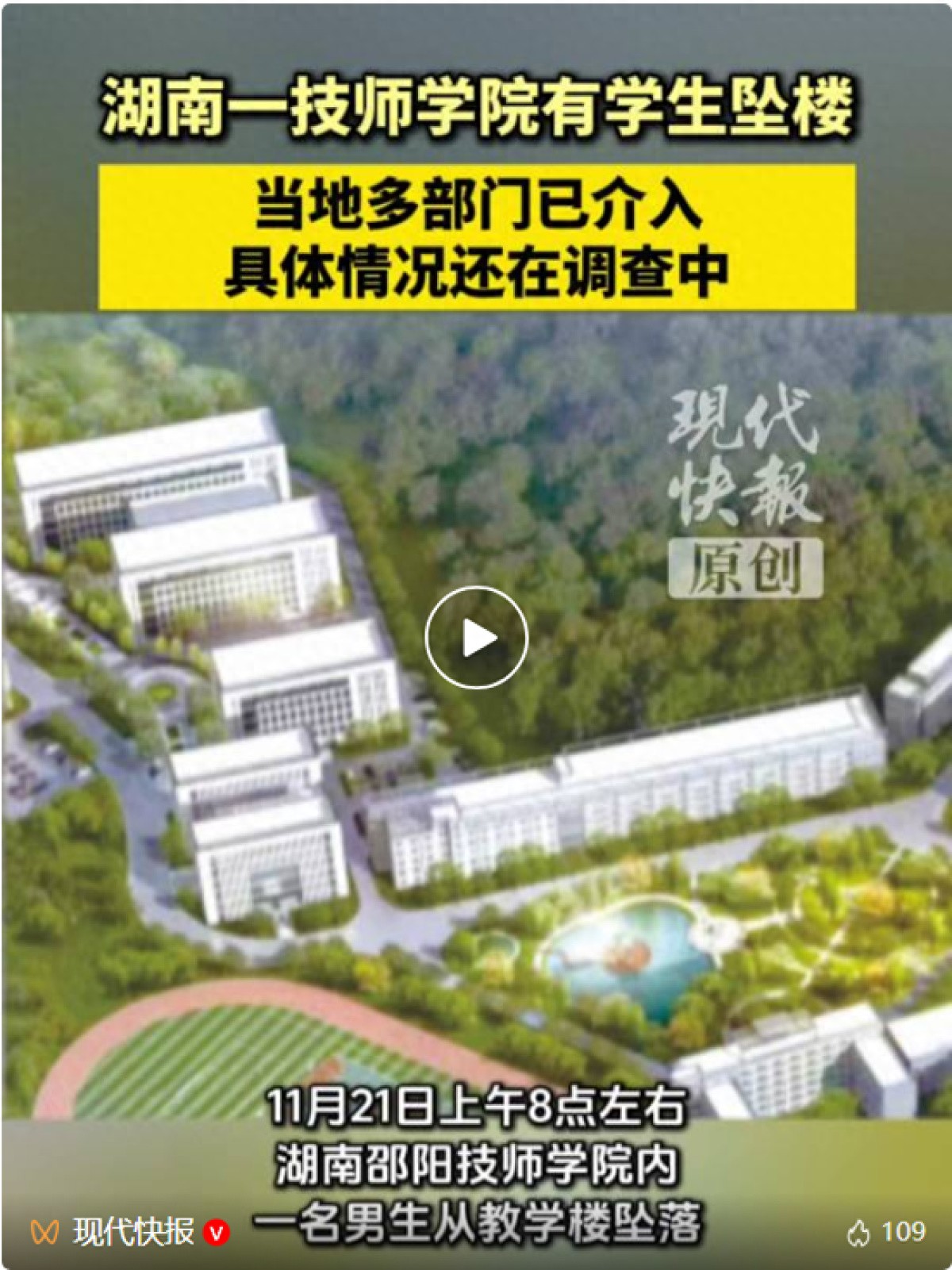 11月21日上午8点左右,湖南邵阳技师学院内一名男生从教学楼坠落。当天下午,现代快报记者获悉,当地多部门已经介入此事。