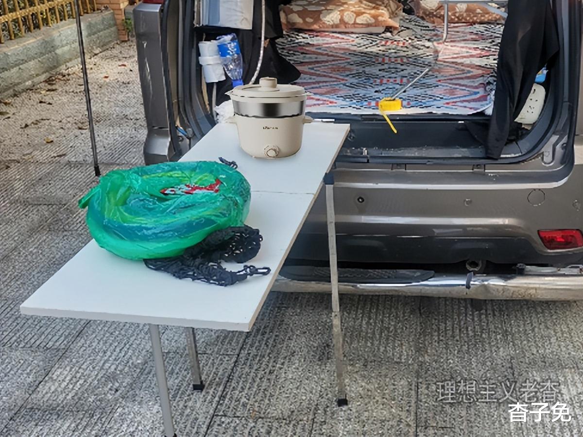 打开上掀式尾门,搬出露营小桌,拿出小电锅,连接上车内移动电源,就可以在户外烧水做饭。