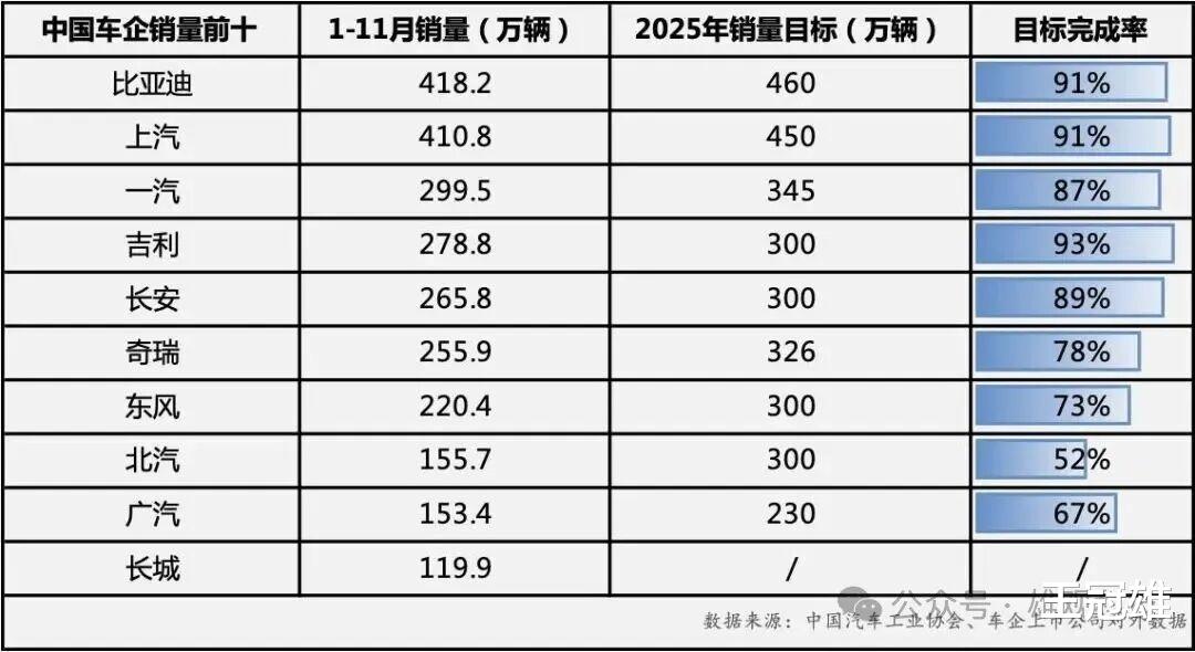 比亚迪表现亮眼持续领跑,从累计数据看,2025年前11个月比亚迪累计销量418.2万辆,同比增长11.3%,年度销量目标完成率超九成。随着12月市场进入冲刺阶段,比亚迪有望超额完成全年目标。