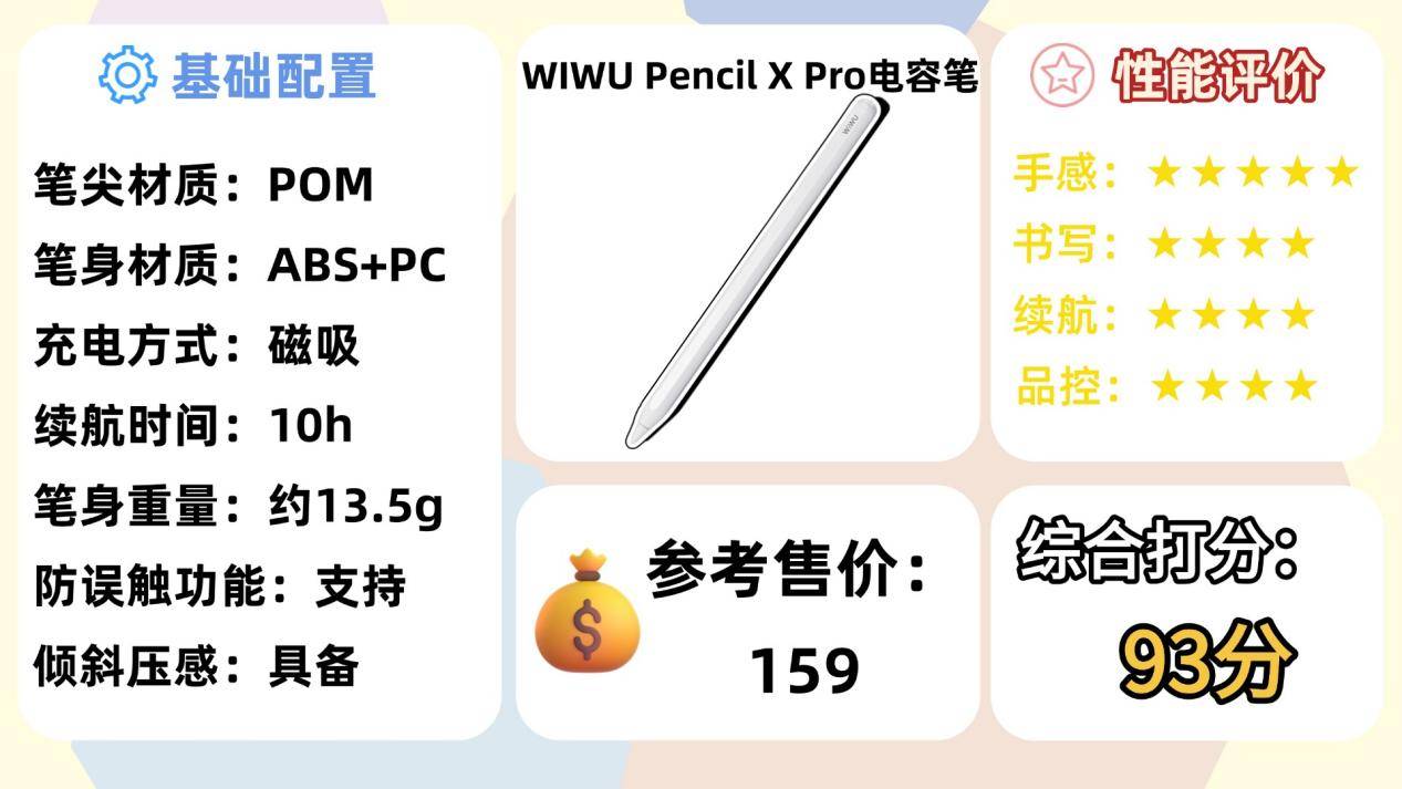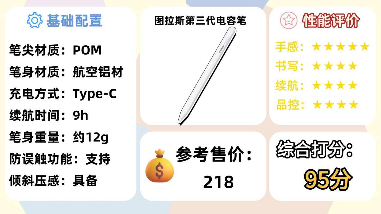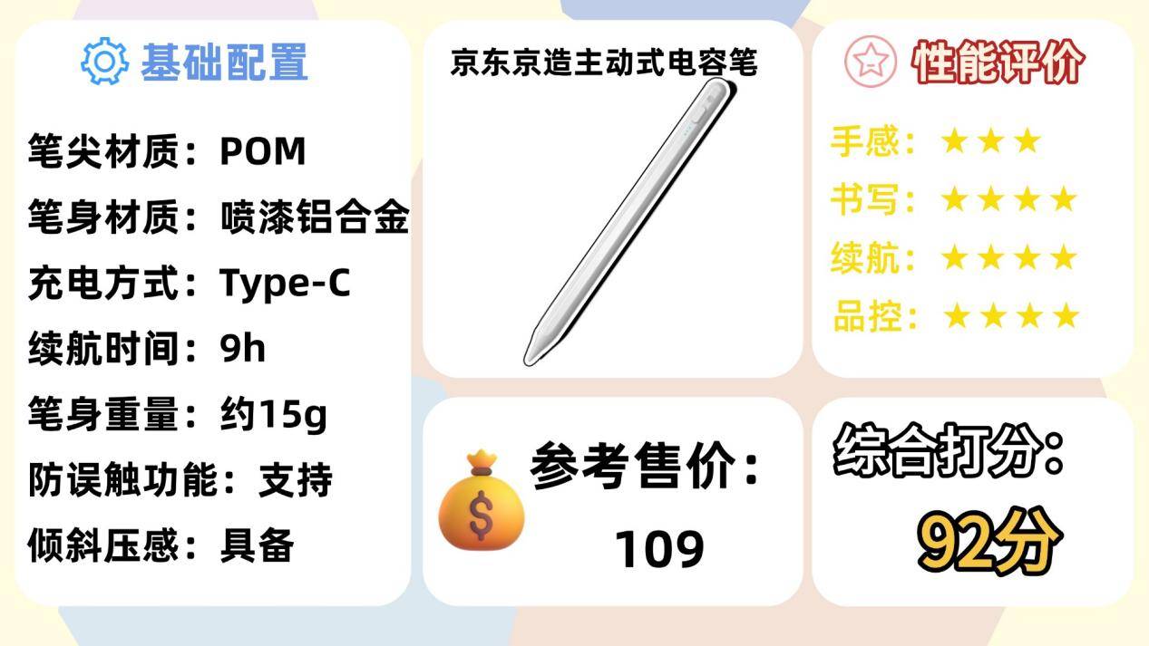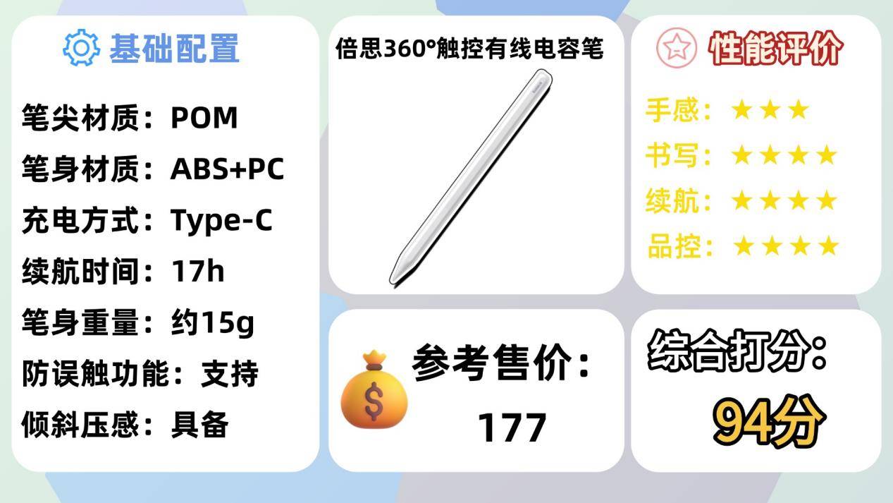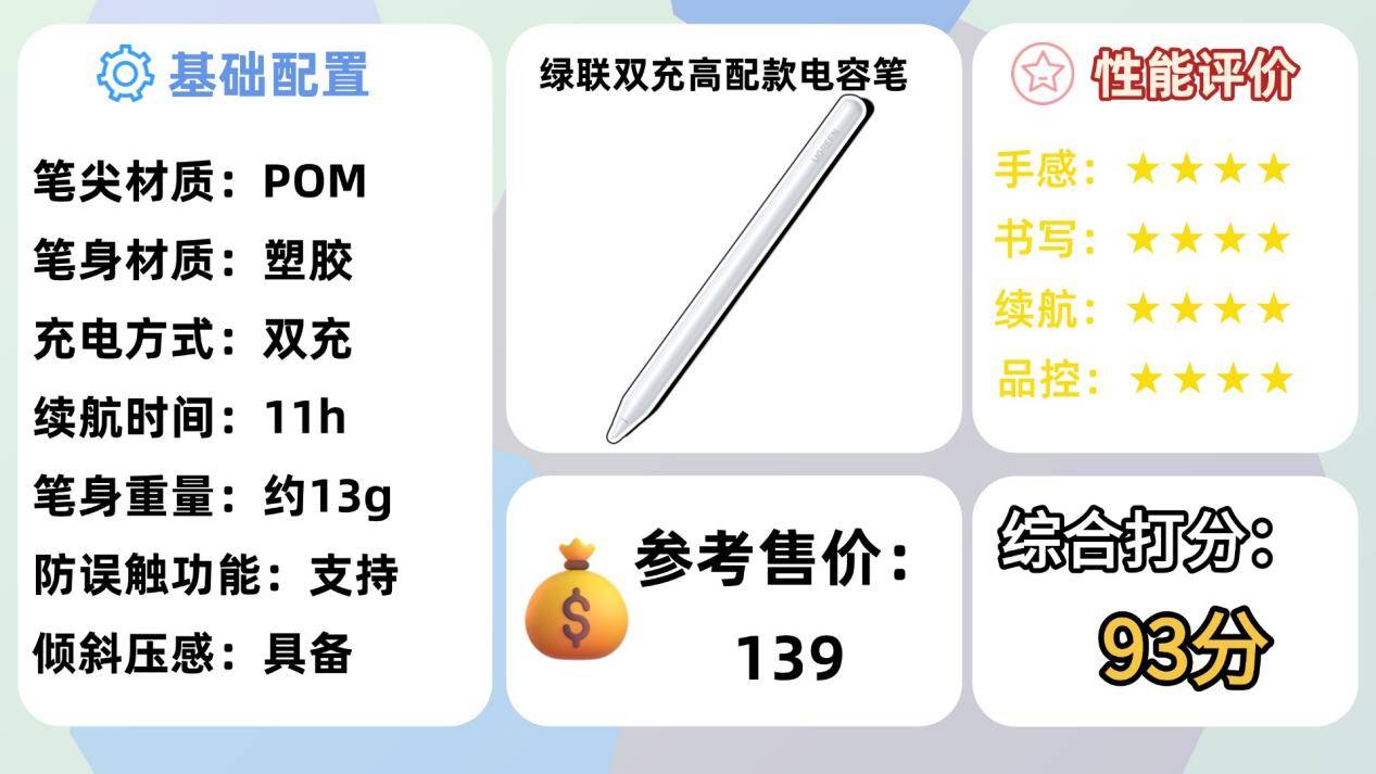 这款电容笔整体设计比较轻巧,单支重量大约只有12克左右,握在手里很舒服,长时间的握笔也不容易使手腕酸痛。而且它支持新型防误触功能,能优先识别电容笔操作,不容易出现误触问题。笔尖材质耐磨且降噪,书写过程流畅。另外它采用Type-C快充接口,充满一次电后大概能连续使用9小时,日常记笔记、绘画都能满足需求。而且支持磁吸iPad,随手放在iPad上就能自动吸附,收纳起来也非常方便。不过相对市面上其他平价电容笔,它的售价略高一些,更适合预算比较充足或者对书写体验有较高要求的用户考虑入手。