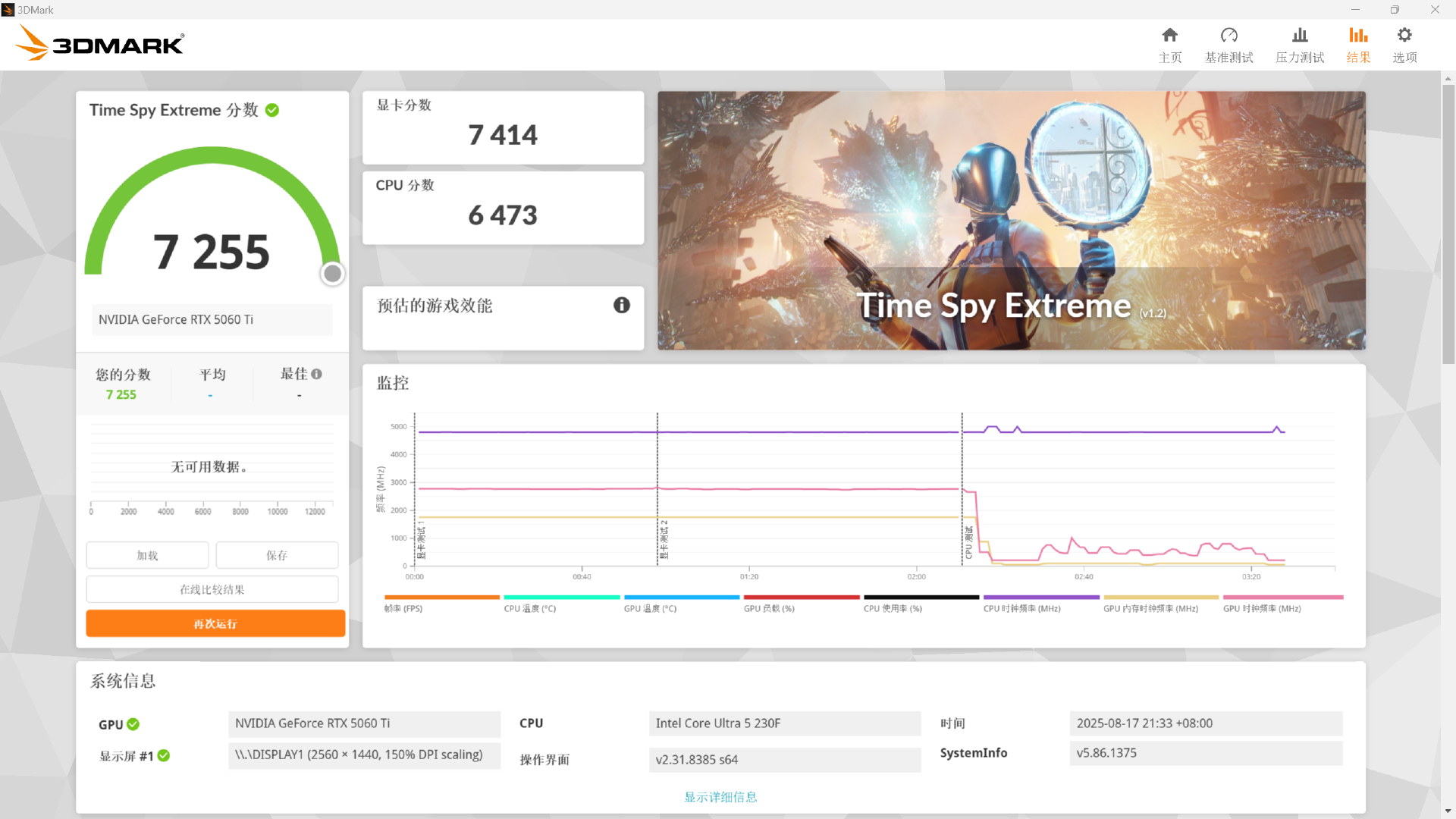 在TSE里,显卡分数为7414分,CPU分数为6473分。