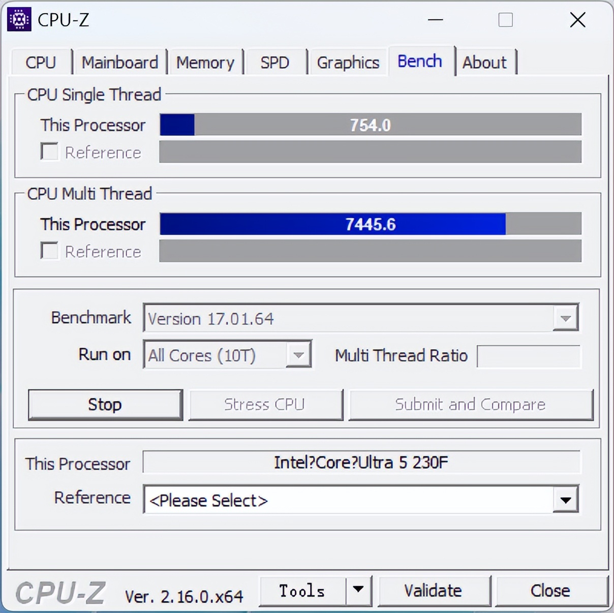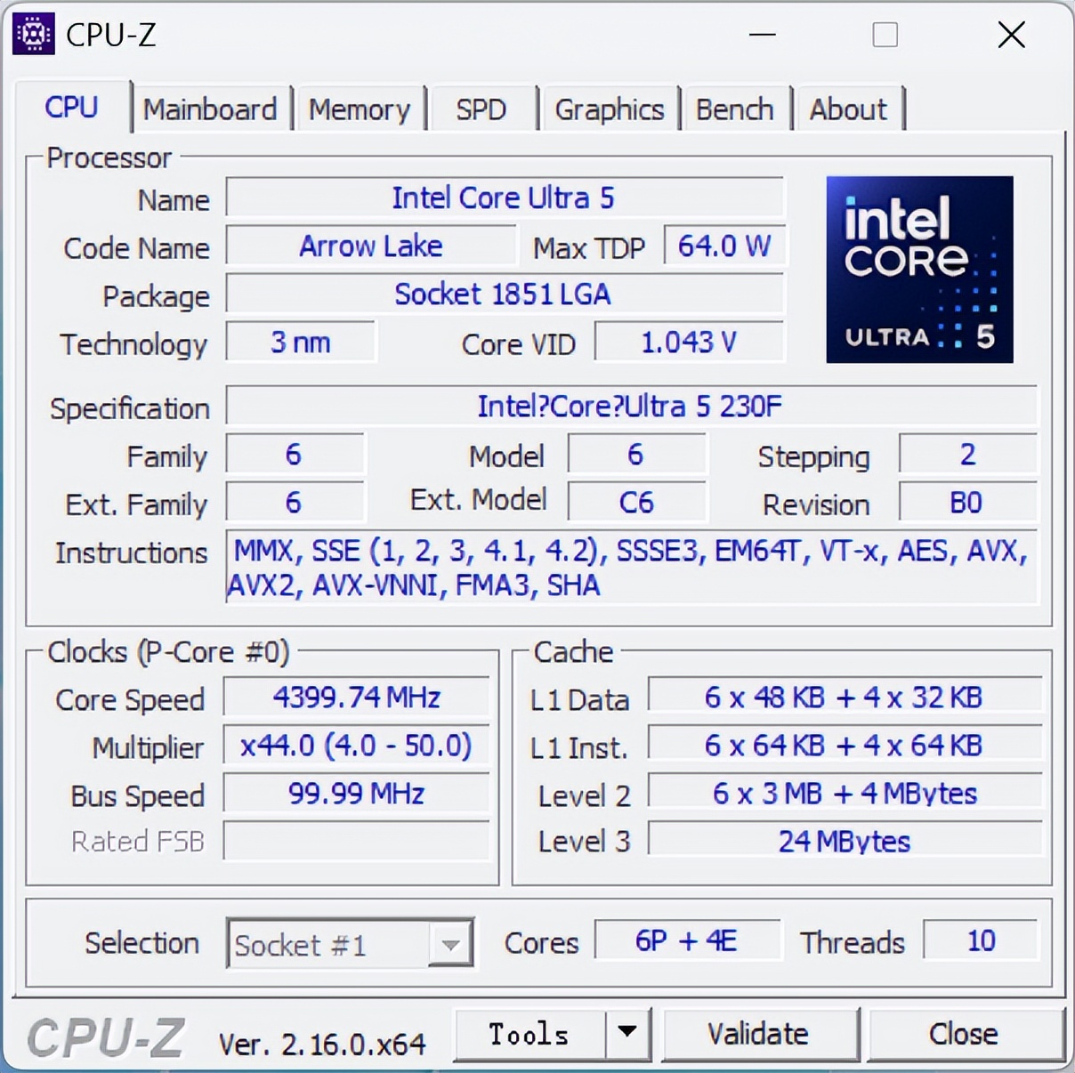 首先看下CPU-Z Ultra 5 230F,基本没啥问题,6P+4E,10核心10线程。