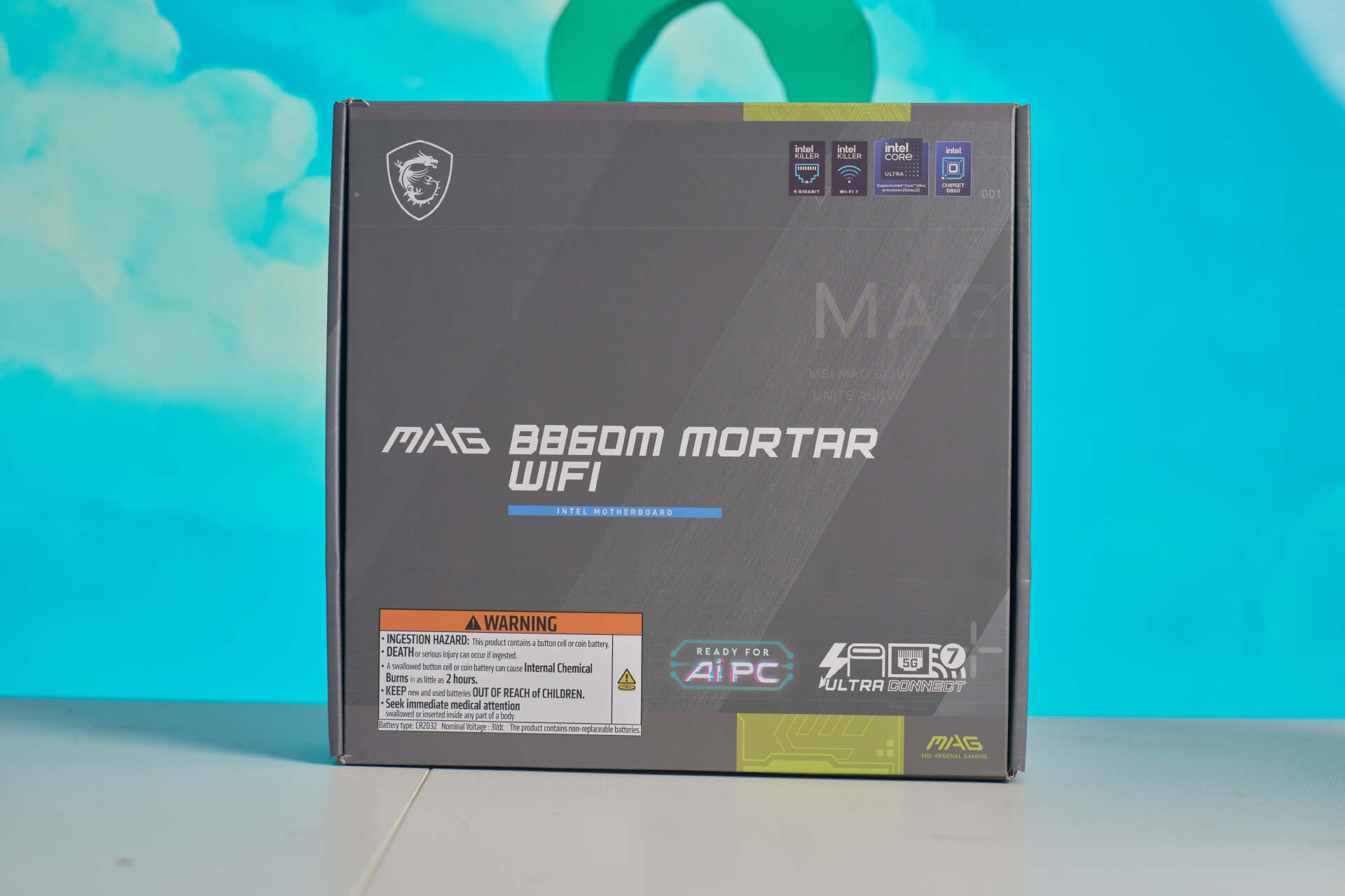 B860MMORTAR WIFI之前就评测过,更换了全新包装,整体是全灰配色,右下角有AIPC,WIFI7 雷电的标识。