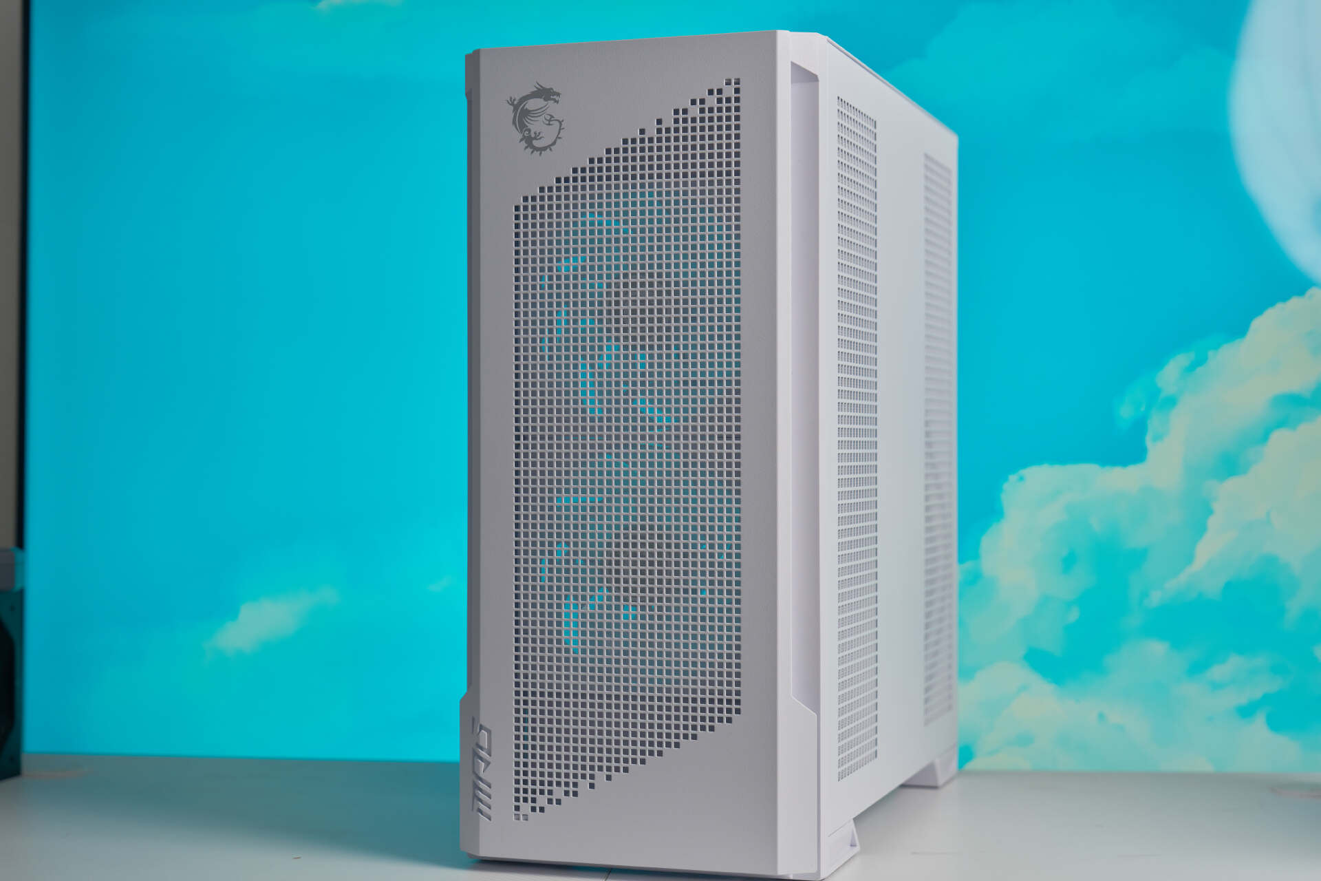 之前,我装过一台刀锋100R机箱,还是挺喜欢的,这次我用上了MPG VELOX 300R AIRFLOW PZ WHITE机箱,也就是刀锋300,应该算是继承了100R的风格。前面板是大面积的网状散热,左上角有微星的龙标。