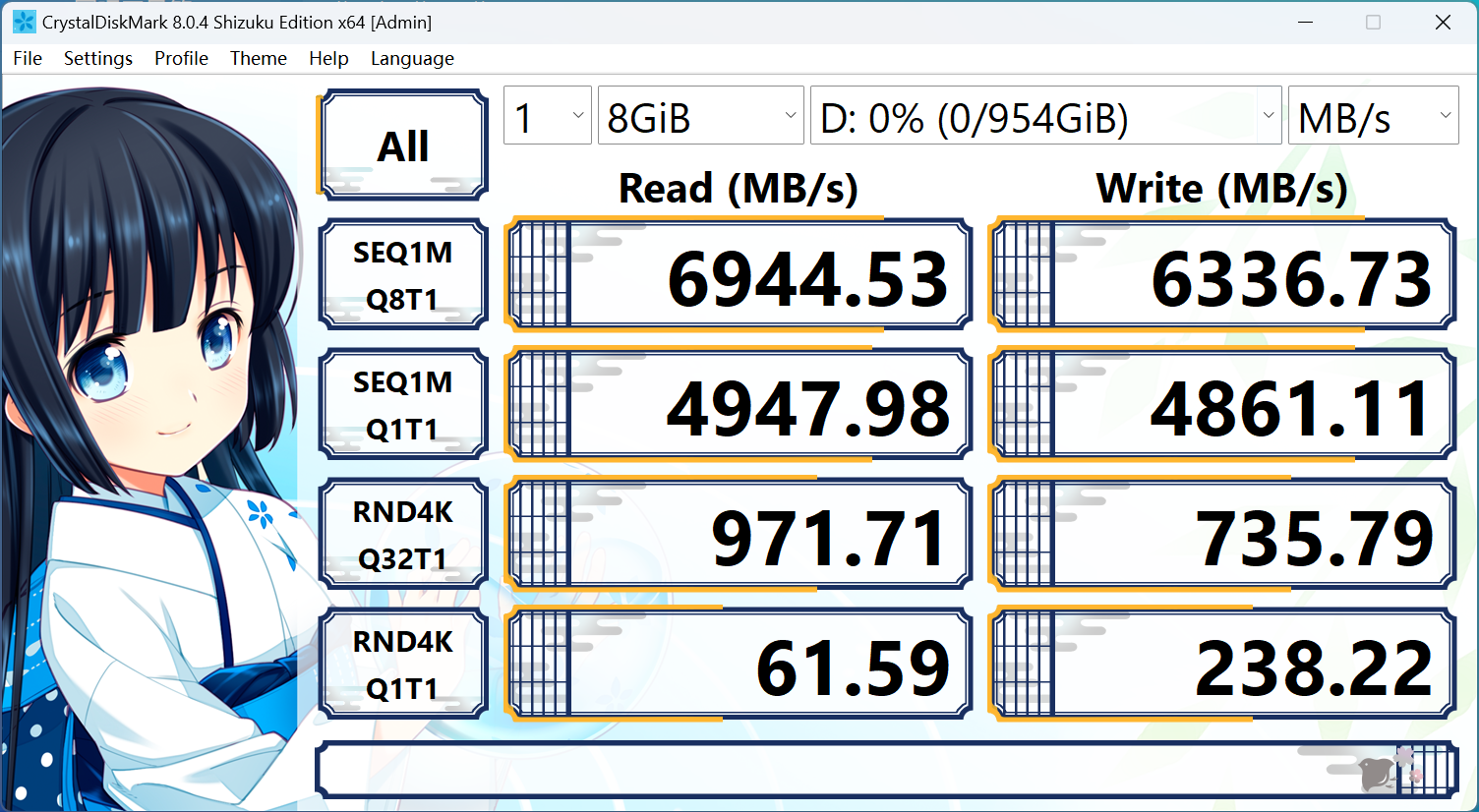 硬盘跑分也正常,读6944.53 MB/S,写6336.73 MB/S,与官方数据吻合,如果想测到7100的读取的话需要上AMD的U。