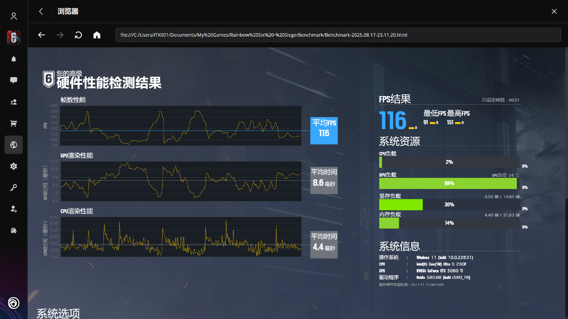 在最新的彩虹六号中,平均帧116.4帧,1%LOW80.6帧,彩虹六号更新后感觉更吃硬件了,尤其是内存频率,测试的帧数确实有点不够看,但如果你想电竞游玩问题也不大。
