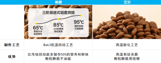 艾尔:采用的是高温膨化工艺,对工艺没有做详细的介绍,高温可以有效消灭饲料中的细菌和有害微生物,生产出来的狗粮也比较酥脆容易咀嚼,表面会微微油腻一些。