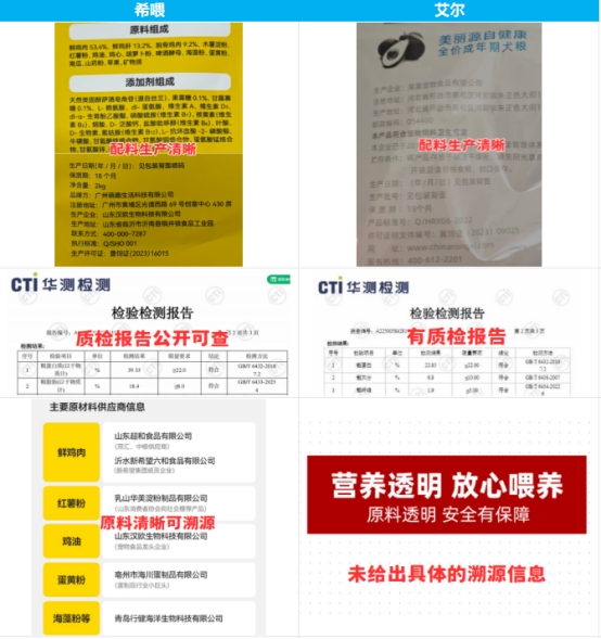 艾尔:由河北荣喜宠物食品有限公司生产,是艾尔的自有工厂,是入围全国十强宠物食品生产企业的工厂。品牌同样给出了华测的检测报告,可以从客服这边获得。产品的各种信息、名称都标注清晰,但并未给出原料供应商的信息,不能够做到具体溯源,但从工厂资质来看品控应该尚可。