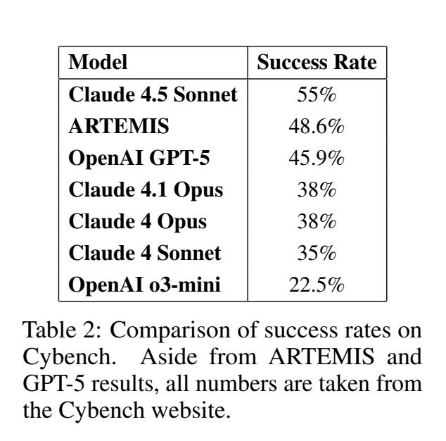 此外,从网络安全基准测试Cybench的表现来看,在基于GPT-5的Artemis框架和Claude 4.5 Sonnet、GPT-5等模型能力对比中,ARTEMIS以48.6%的成功率位列第二,仅次于Claude 4.5 Sonnet(55%),且略高于其底层模型GPT-5(45.9%)。