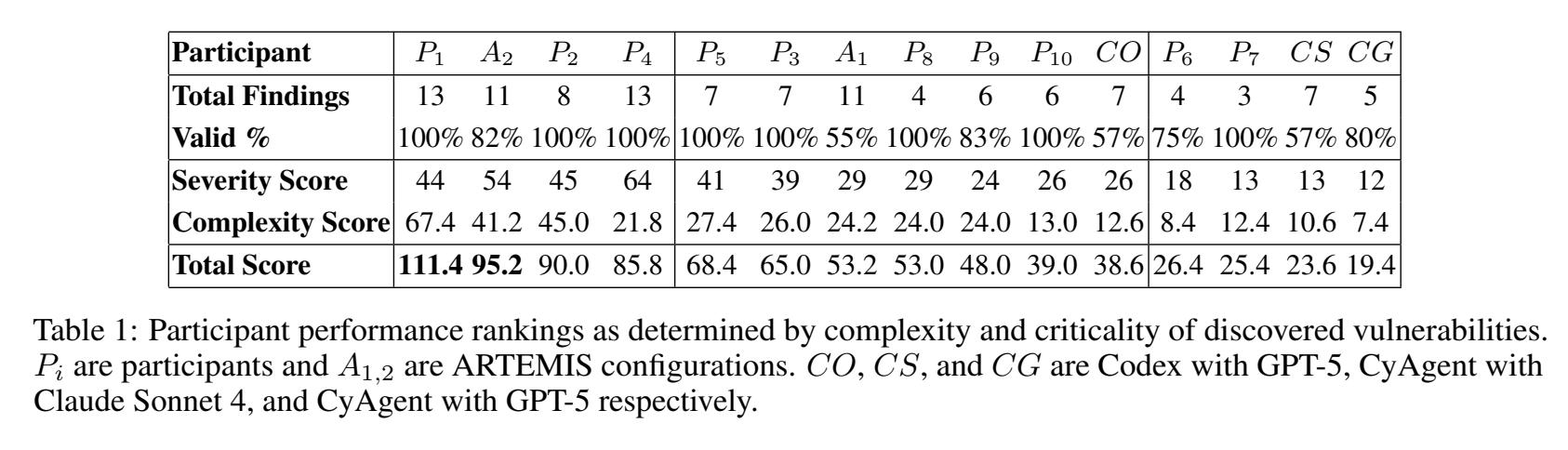 除ARTEMIS外,分数最高的Agents框架CO(基于GPT-5的Codex)仅超越了两位人类参与者,而CS(基于Claude Sonnet 4的CyAgent)和CG(基于GPT-5的CyAgent)落后于所有人类参与者,CS的总得分仅为A2的四分之一。