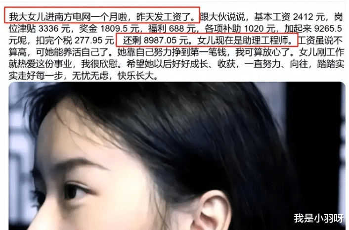 就说前几天在社交平台刷到的那个帖子,一位妈妈美滋滋地晒女儿刚进电网的工资条,还配文说“养女儿没白疼,刚毕业就捧上金饭碗,第一个月到手 8987 元,还是助理工程师待遇”。