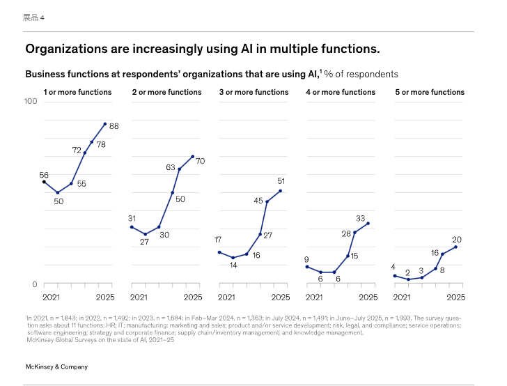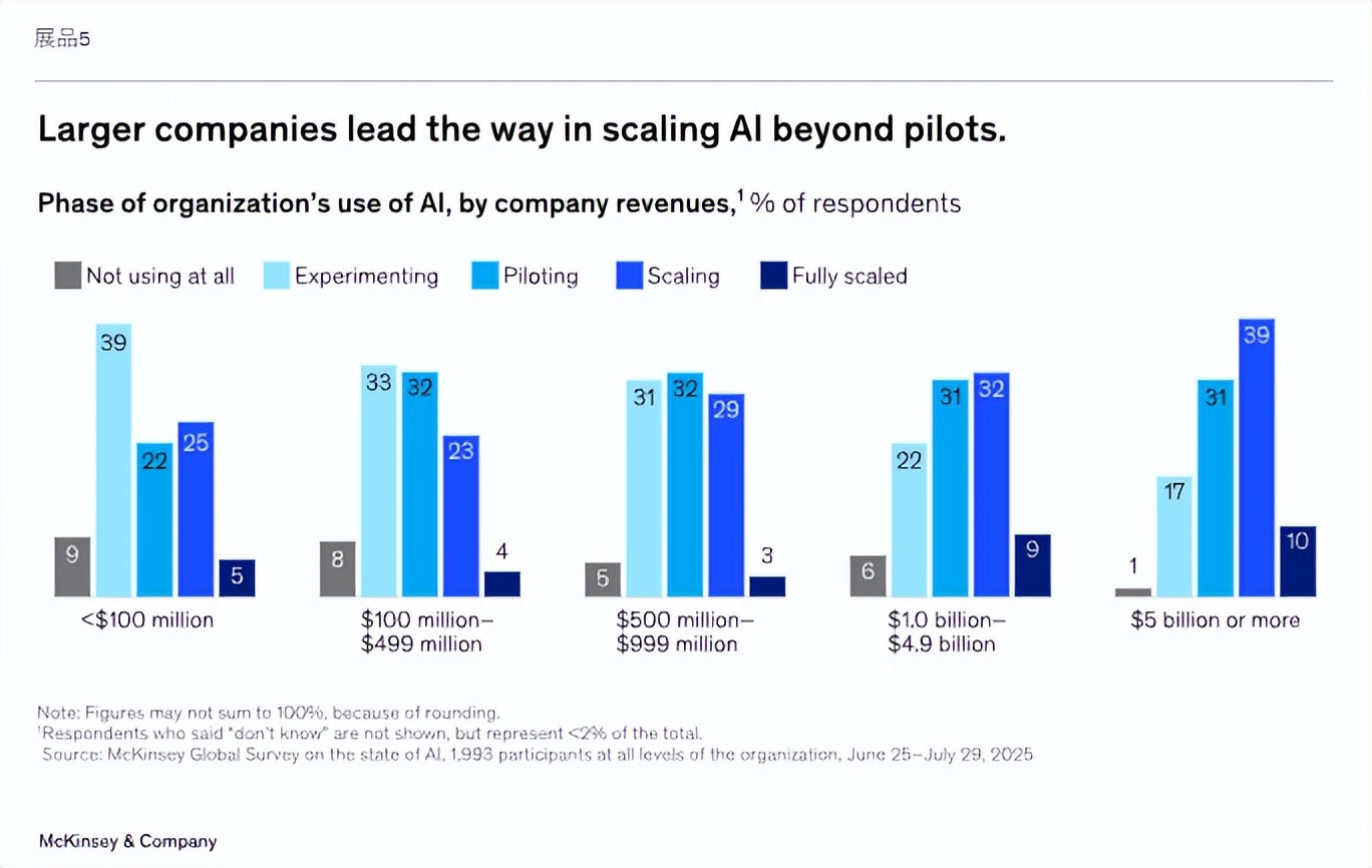 麦肯锡《2025年人工智能的发展现状:智能体、创新与转型》数据显示,超过2/3的受访者表示其组织已在多个职能中使用AI,50%的受访者表示已在三个及以上职能落地AI应用;但在收入超过50亿美元的大型企业中,近50%已进入AI规模化应用阶段,而在收入低于1亿美元的中小企业中,这一比例仅为29%。