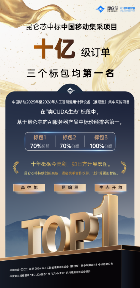 过硬的产品实力,让昆仑芯已深度落地互联网、金融、运营商等关键行业,在多个重磅项目中脱颖而出——2025年8月,昆仑芯一举中标中国移动十亿级AI设备集采项目,包揽三大标包份额第一。