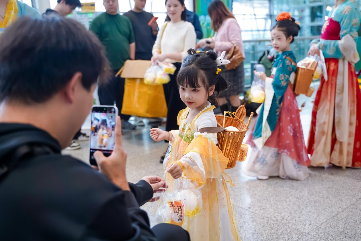 同日下午,盛唐秋韵又蔓延至长沙地铁1/2号线五一广场站厅。这里迎来了一场以“千灯映月 桂满铜官”为主题的站厅活动。现场除“小嫦娥”和“小玉兔”们继续与市民互动、舞蹈演员们继续进行舞蹈演绎之外,还设有“猜灯谜”挑战区。市民们通过关注铜官窑国风乐园的官方账号即可参与互动,挑战成功者便能获赠精美月亮灯一盏。