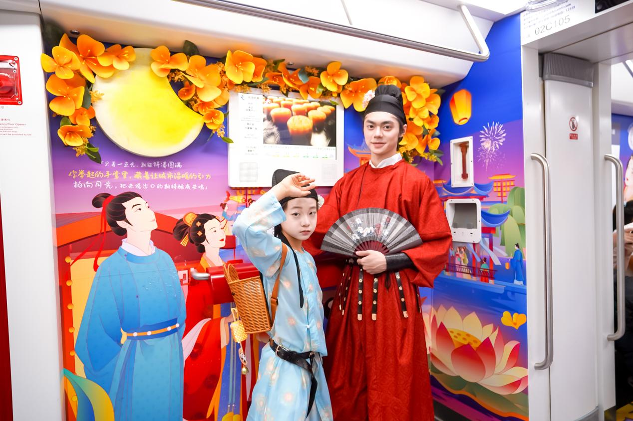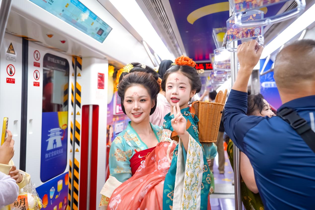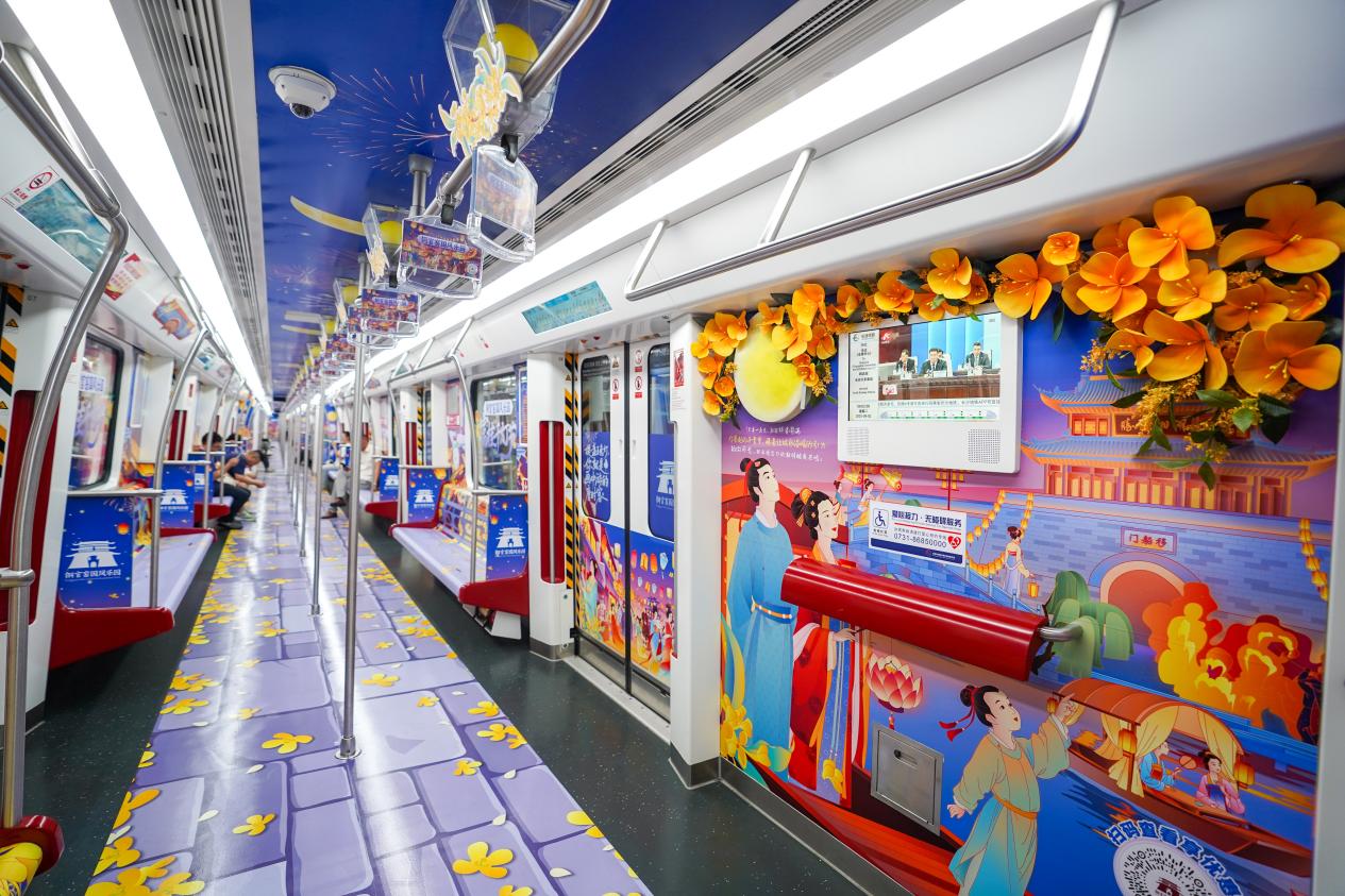 秋意渐浓,星城长沙飘起了第一缕桂花香。9月2日,一列别具唐风古韵的“富桂千灯节”主题列车,悄然驶入长沙地铁2号线,成为城市流动的艺术风景。这列由铜官窑国风乐园精心打造的主题列车,以金桂、明月、千灯为主要元素,将“富桂千灯节”的节庆氛围带入市民的日常通勤之中。车厢内不仅布置有实体月亮灯与仿真桂花艺术装置,更以沉浸式场景复刻大唐秋夜盛会,为市民开启了一段诗情画意、如梦似幻的文化之旅。