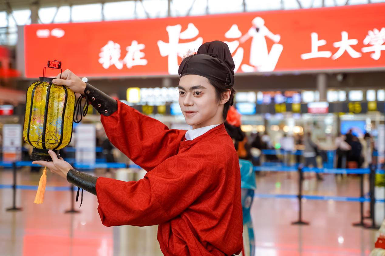 傍晚时分,华灯初上,铜官窑国风乐园的快闪之旅迎来了第三站——长沙黄花国际机场T2航站楼。17点左右,悠扬的乐声骤然响起,舞蹈演员们手持月亮灯与桂花枝,舞姿舒展如云卷云舒,以一曲唐舞吸引了大批旅客驻足,为风尘仆仆的行人们献上了一份极具湖湘特色的诗意迎礼。机场作为城市门户,在此举办快闪活动进一步扩大了活动的影响范围,实现了对文旅消费人群的深层触达,也更加彰显了铜官窑国风乐园作为城市文旅名片的品牌温度。
