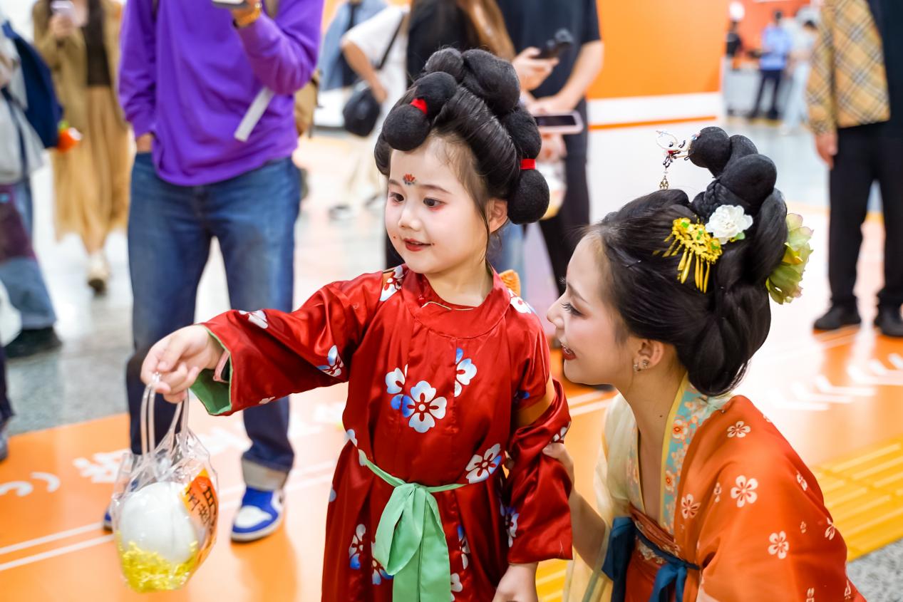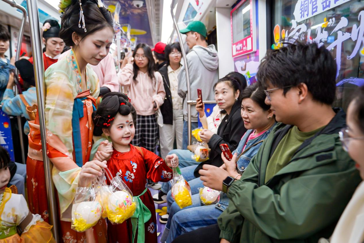 9月20日上午,这场文化盛宴从“静态展示”走向“动态展演”。主题列车摇身一变,化身为一座流动的舞台。六名由小朋友们扮演的“小嫦娥”和“小玉兔”手提月亮灯,与市民乘客亲切互动、合影留念,并送上暖心祝福和精美礼品,激发了大众自主传播的热情。随后,数位身着唐风服饰的舞者和乐手翩然现身于车厢,带来了精彩的舞蹈演绎。舞蹈演员们衣袂飘飘、步摇轻颤,仿佛从古画中走来。这一刻,地铁不再只是交通工具,更成为衔接古今的文化走廊。