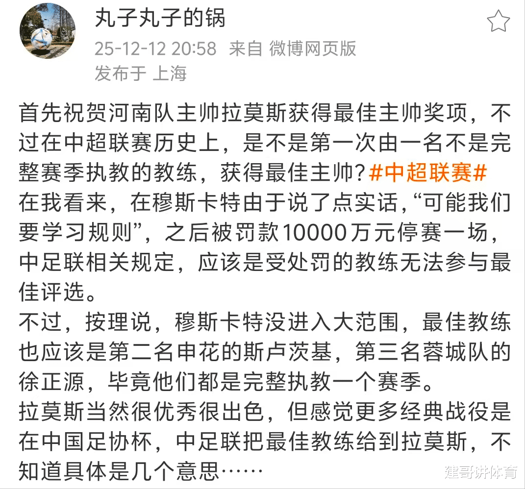 这位上海知名媒体记者更新社交,写到:中超联赛历史上,最佳教练是不是第一次由一名不是完整赛季执教的教练得到?在我看来,穆斯卡特由于说了点实话,“可能我们要学习规则”,之后被罚款一万元加停赛一场,在中足联规定被罚的教练无法评选的前提下,穆斯卡特没有机会后,也应该是第二名上海申花的斯卢茨基或第三名成都蓉城的徐正源拿奖,把最佳教练给拉莫斯,真不知道足协是几个意思。