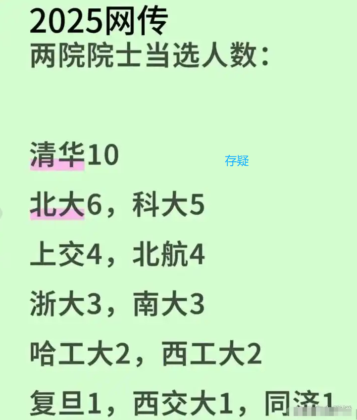 这几天关于2025年院士评选的结果很多人都在发声,不少人信誓旦旦的说已经出结果了,还有人专门发文称清10北6科5上4复1浙3南3哈工西工各2。