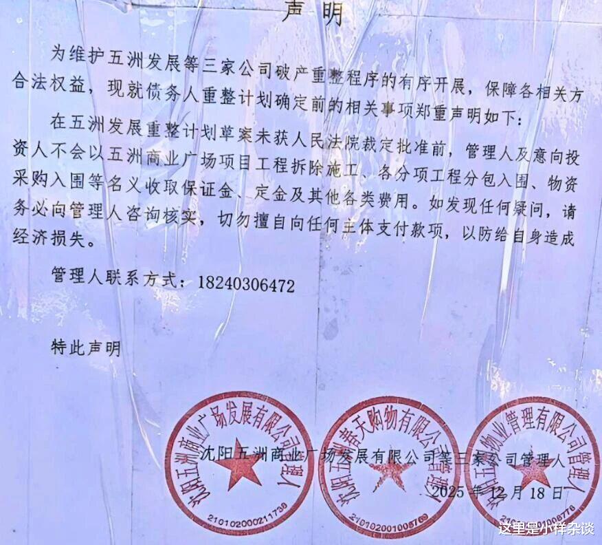 (图片来源于网络)就这样保持到2019年,这个项目进行破产清算,但是之后这些年也一直没有啥改变,直到2023年,有人在某网站咨询,得到的官方回复:经了解,目前太原北街闲置资源主要是原五洲商场B、C座,即原五洲春天和华联商厦,多年来区政府一直积极探寻解决五洲闲置资源盘活工作。该项目在2019年进行破产清算,2021 年区法院受理此案。现该项目有意向投资人对于该地块进行盘活,初步计划将对闲置商业面积进行升级改造,以“热带雨林文化”为主题,配合N处小的沐光雨林中庭,打造特色“生态与光”室内步行街,通过发展生态文化和当代艺术等多种功能,使生态文化贯穿到五洲商业的各个方面中,提升城市商业品质和生活品质,实现沈阳商业的品质化升级。满足传统城市旅游和场景空间消费新需求,最终成为城市文化的名片。可是又这样过去了好几年了,这个项目也一直没有进行升级改造,虽然没有实际进展,但是这几年小道消息是一直不缺,甚至传出来这里要盖个SKP的小道消息。最近项目上贴了一个通知,内容如下: