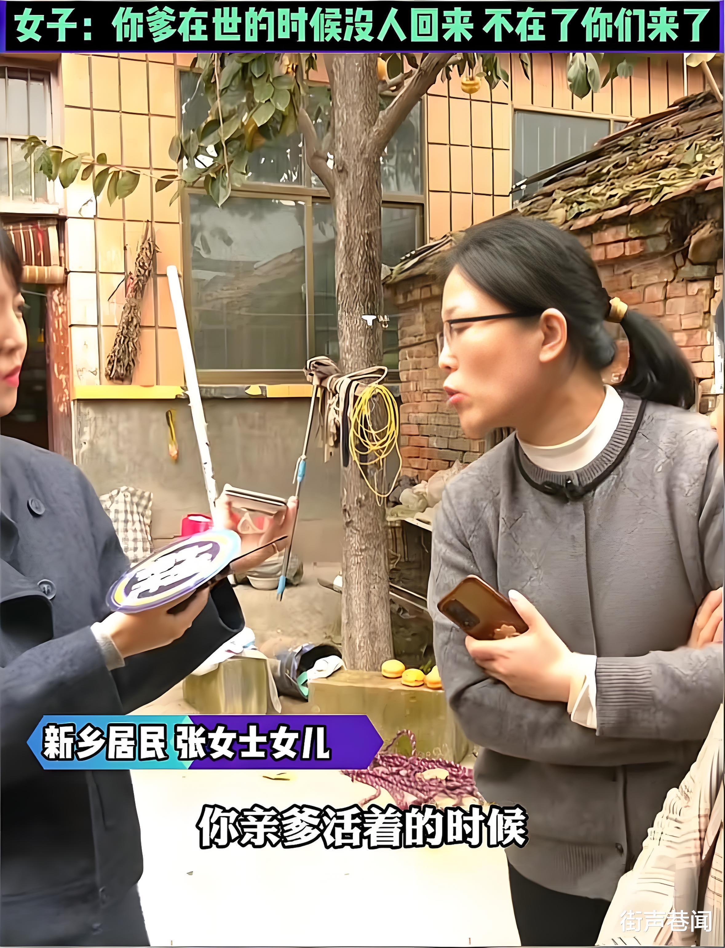张阿姨的女儿实在听不下去了,对着电话喊道::“你亲爹活着的时候你们女儿儿子都不来,亲爹死了,你们出来了。”