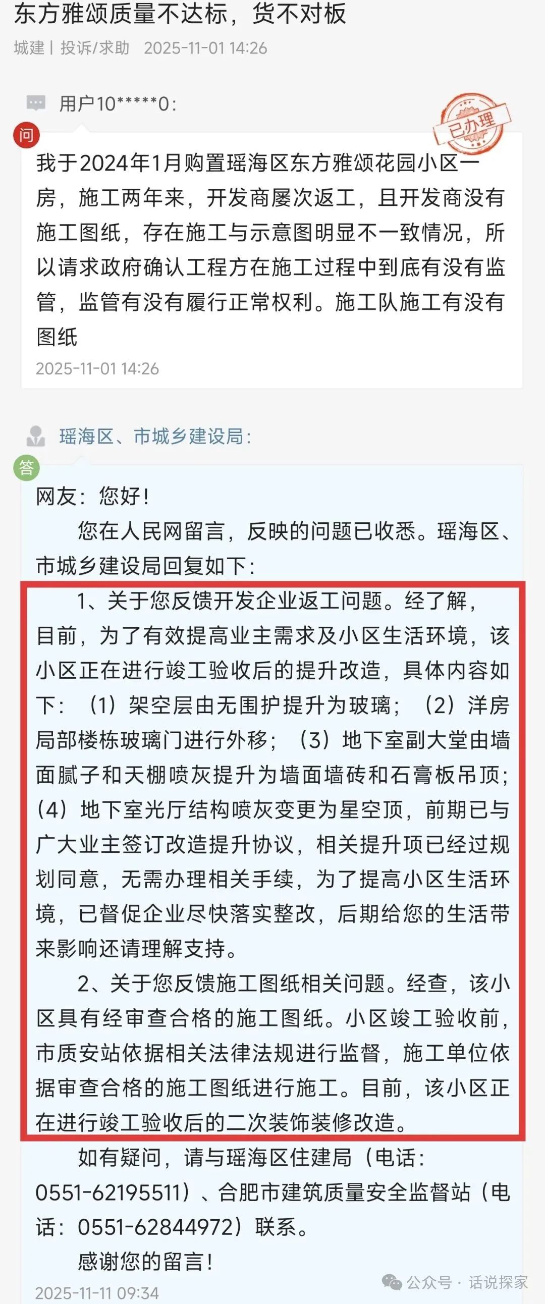 瑶海区、市城乡建设局回复如下: