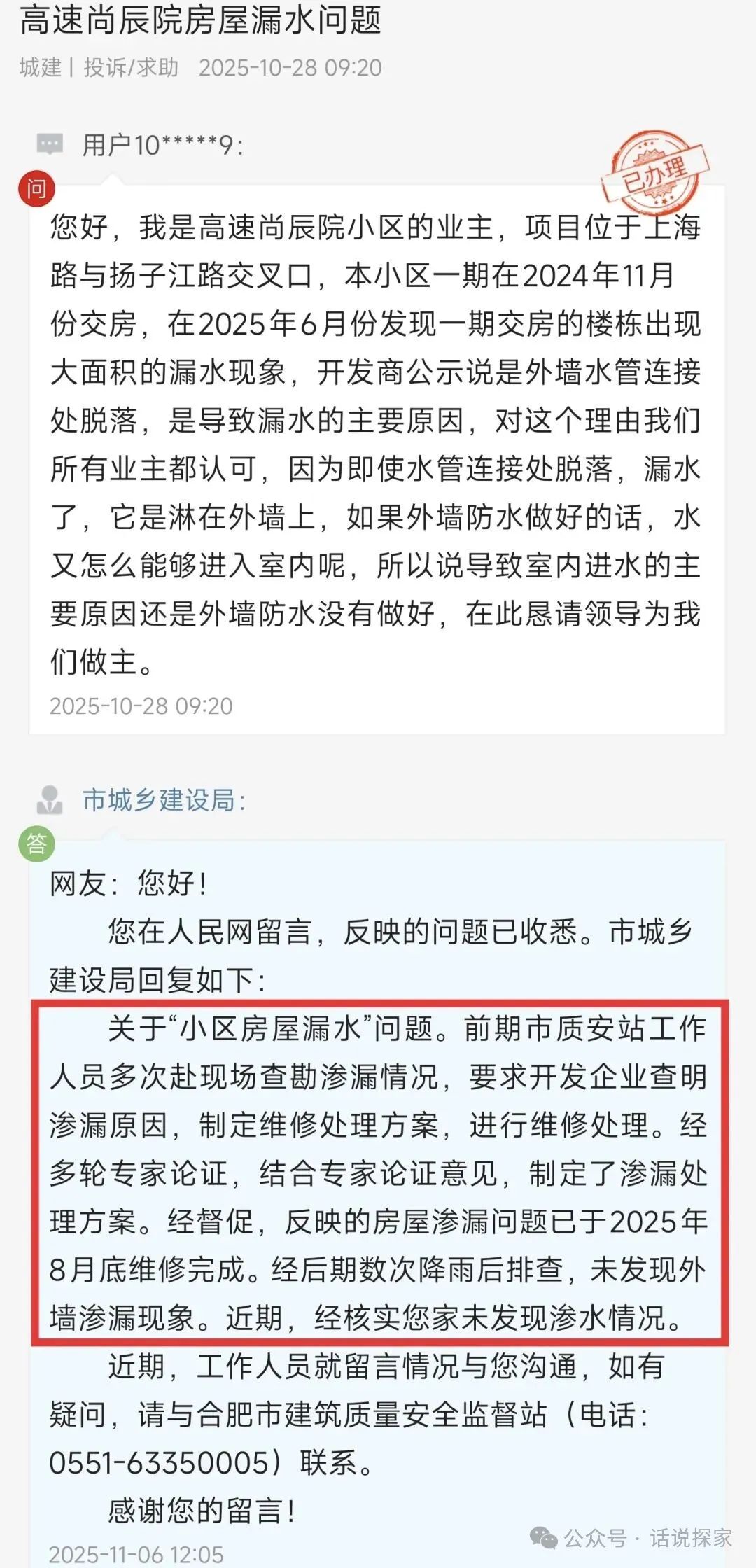 经多轮专家论证,结合专家论证意见,制定了渗漏处理方案。经督促,反映的房屋渗漏问题已于2025年8月底维修完成。经后期数次降雨后排查,未发现外墙渗漏现象。近期,经核实您家未发现渗水情况。