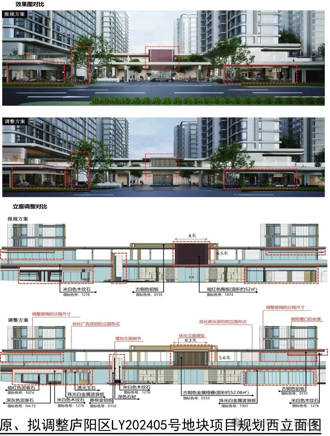 将项目西侧出入口处景墙材质由暗红色陶板调整为古铜色金属格栅、同时结合商业运营的需求对入口处沿街立面细节进行调整。本次变更不涉及指标调整。经研究,拟同意该调整,具体详见公示图纸。