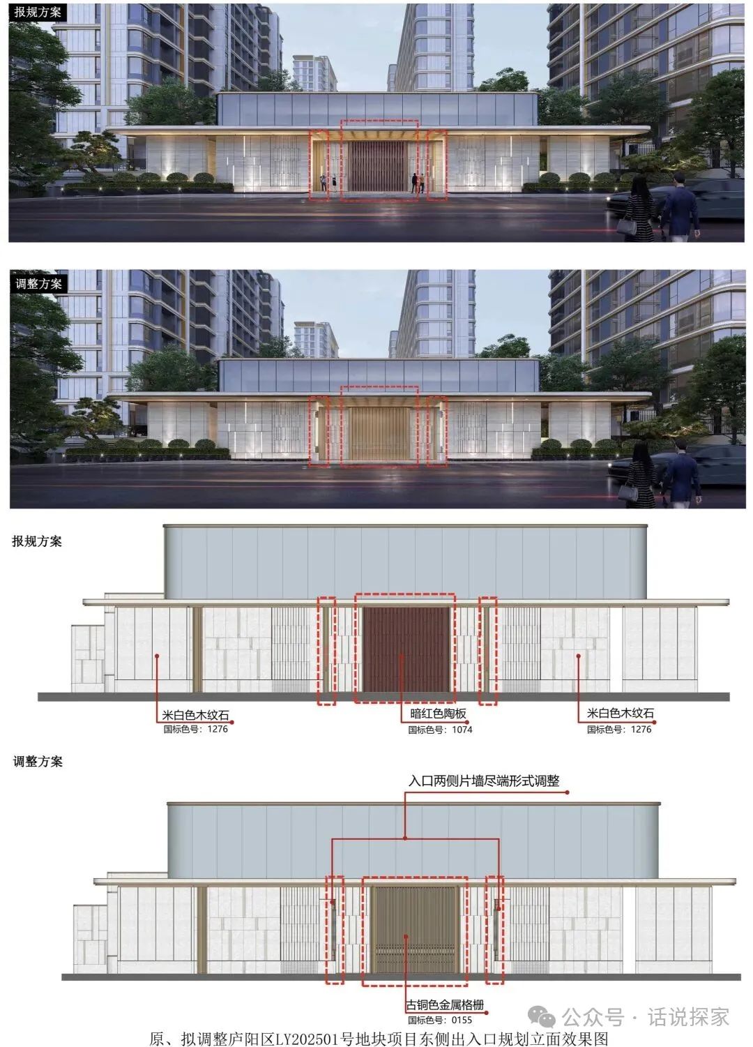 拟将项目东侧出入口处景墙材质由暗红色陶板调整为古铜色金属格栅,两侧片墙尽端形式进行调整。本次变更不涉及指标调整。经研究,拟同意该调整。