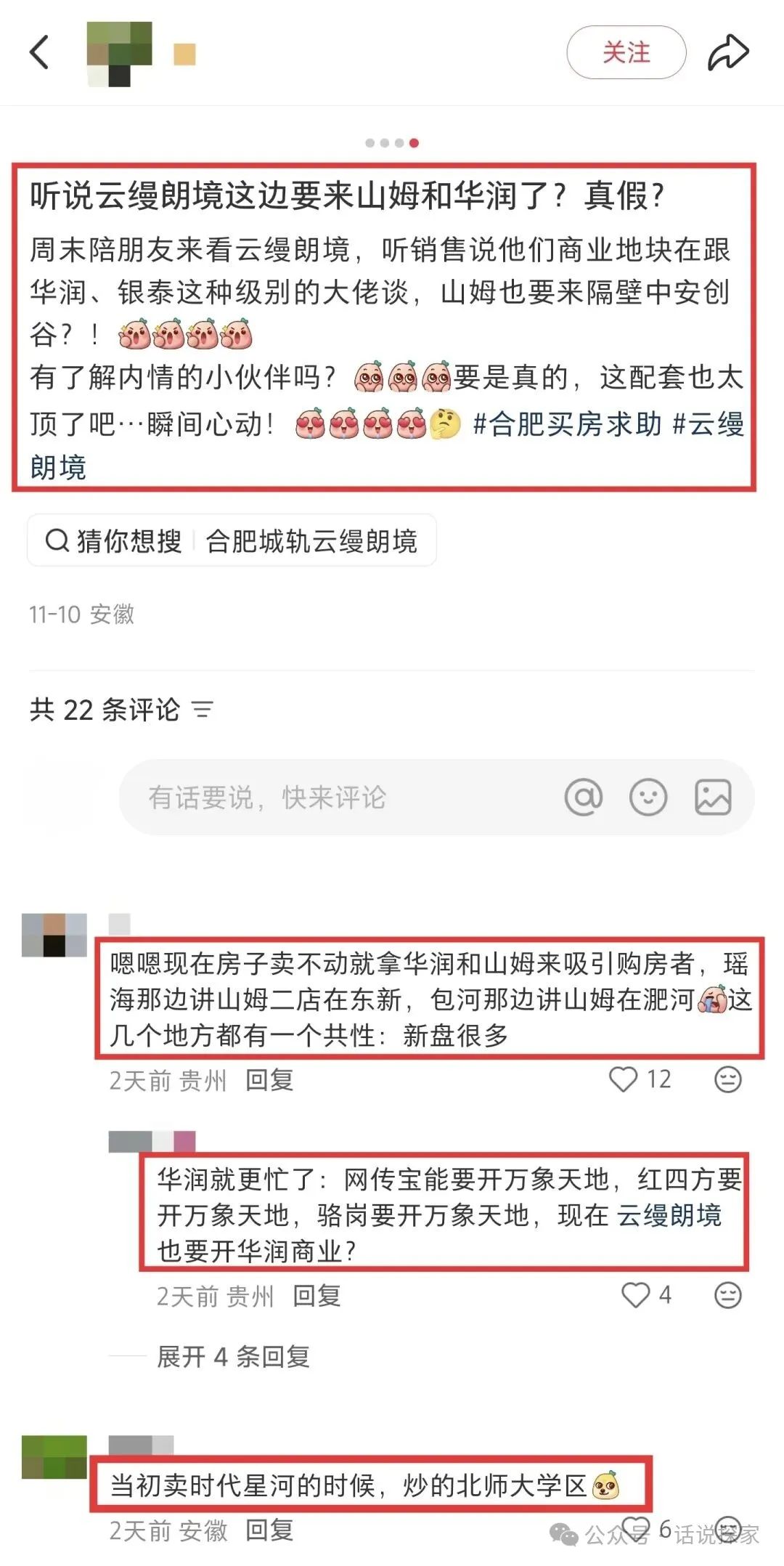 合肥高新区某盘,网传的消息一个比一个玄乎,一会说是有员工房便宜几十个,网友吐槽说是后期可有望干到1.4,一会又说是将引进的商业是华润或银泰、甚至山姆超市。
