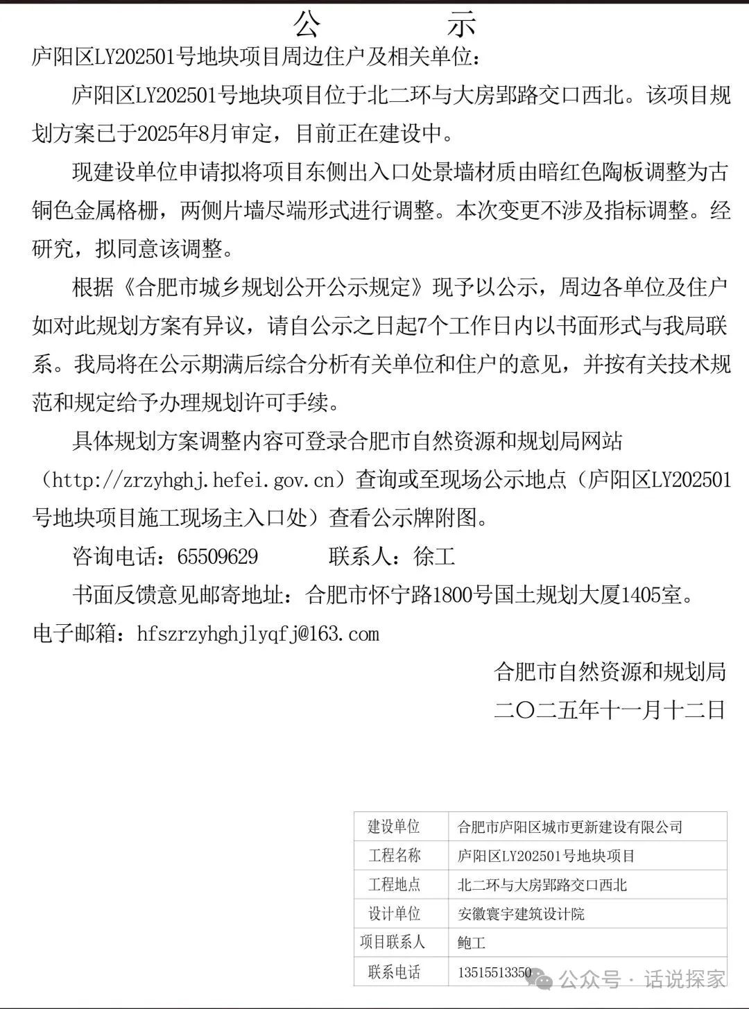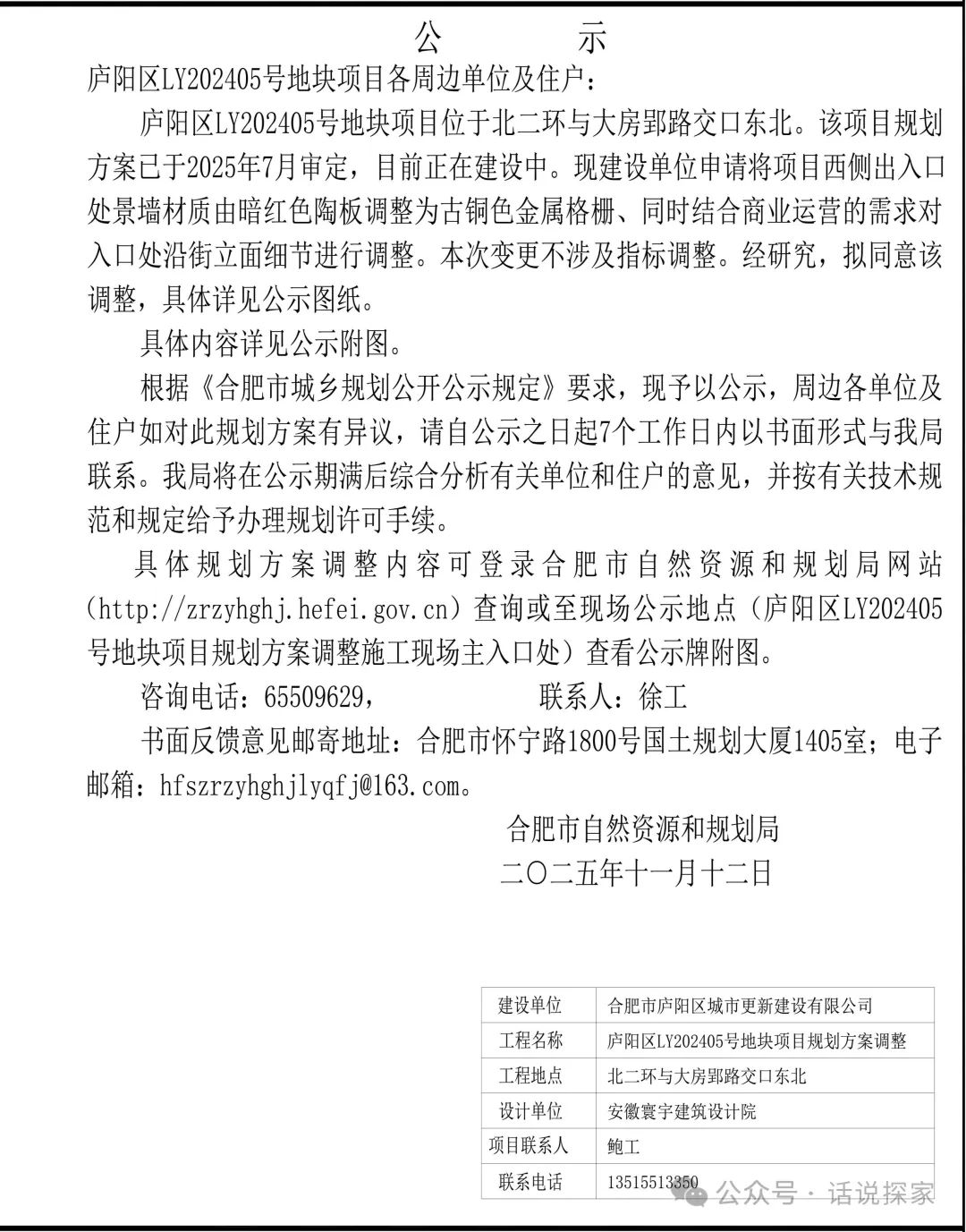 庐阳城更LY202501号地块规划方案调整公示,即招商庐州致境西地块,位于庐阳区北二环路与大房郢路交口西北角,具体如下: