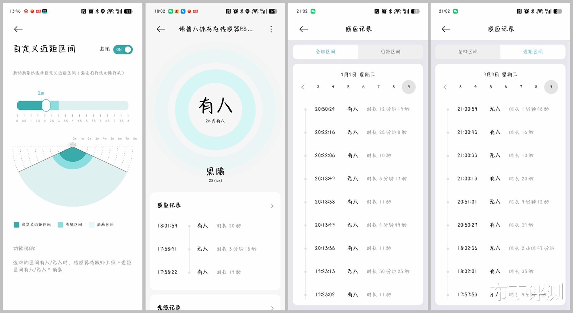 相比其他传感器,领普ES5还支持近距区间侦测,而且还能自定义近距区间。当开启“自定义近距区间”功能后,可以看到系统界面会显示远距和近距的侦测结果,相当于同时安装了两个传感器,而且在“感应记录”中还能单独查看近距区间记录。