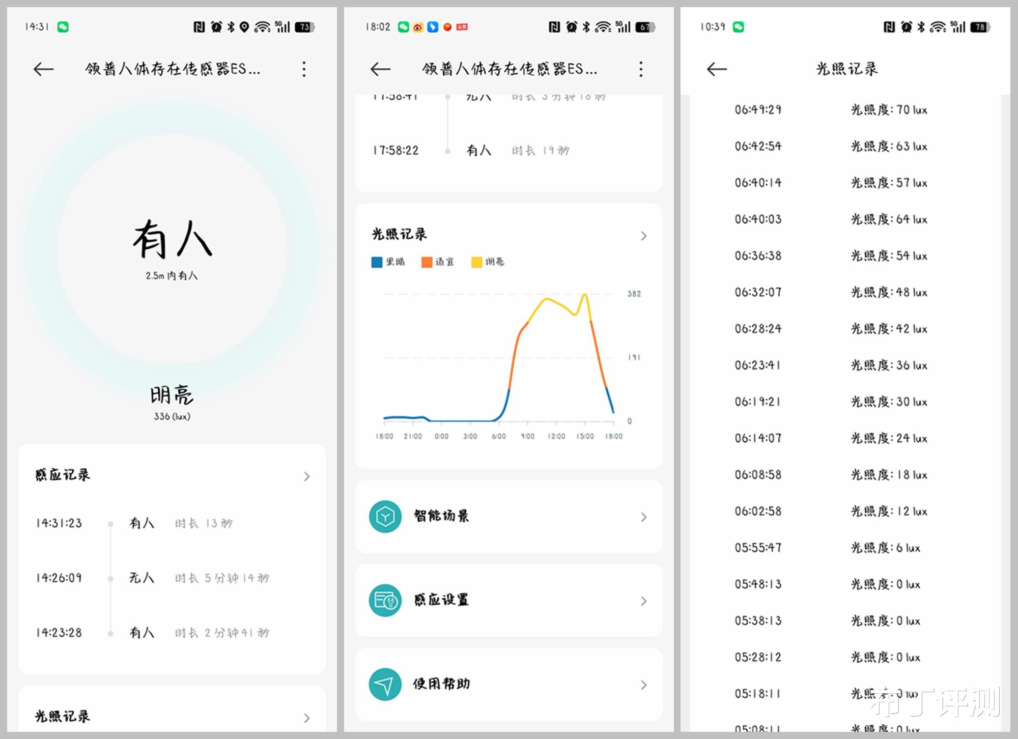 进入到系统主界面,不仅能查看领普ES5的当前状态,而且还拥有感应记录、光照记录、智能场景、感应设置、使用帮助等多个选项,其中通过感应记录和光照记录,能够查看详细的感应和光照度情况。
