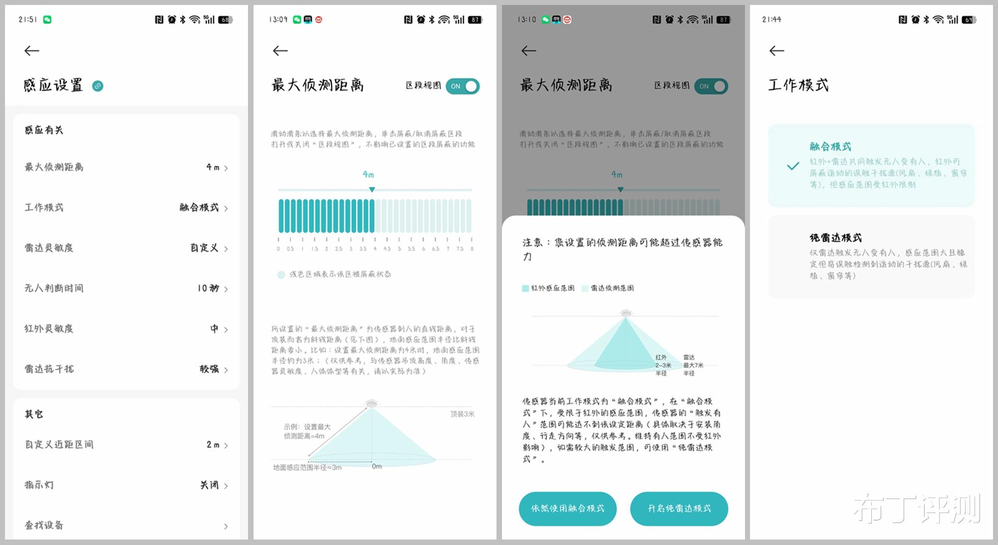 领普ES5采用雷达+光感+红外热释电多种感应模式,通过“感应设置”能进行详细的设置操作,可以对侦测距离、工作模式、雷达灵敏度、红外灵敏度等进行快速设置。传感器支持红外+雷达融合模式和纯雷达模式,其中雷达支持最大直径14米运动探测和最大直径10米存在探测,融合模式虽然探测直径只有4米-6米,不过抗干扰能力更强。