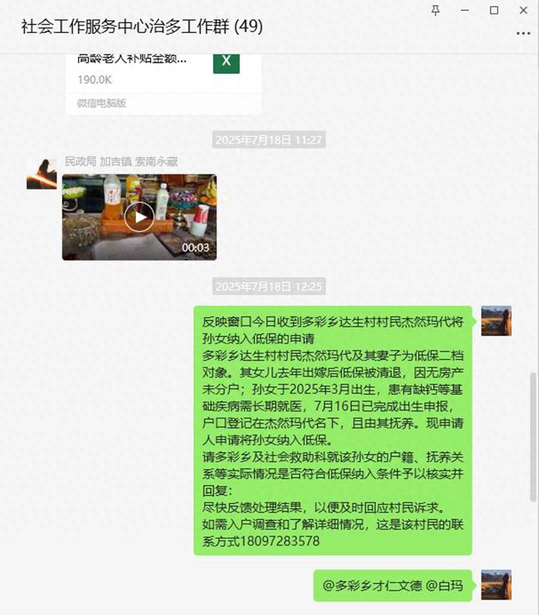 群众诉求无小事,民生问题大于天。反映窗口在接到杰然玛代的申请后,高度重视这一特殊家庭的困难情况,第一时间启动快速响应机制。一方面,迅速安排多彩乡民政工作站工作人员深入达生村,实地核查杰然玛代家庭的户籍情况、孙子的实际抚养关系以及家庭经济状况;另一方面,同步协调局社会救助科,对照低保政策相关规定,对该孙子是否符合低保纳入条件进行细致研判。