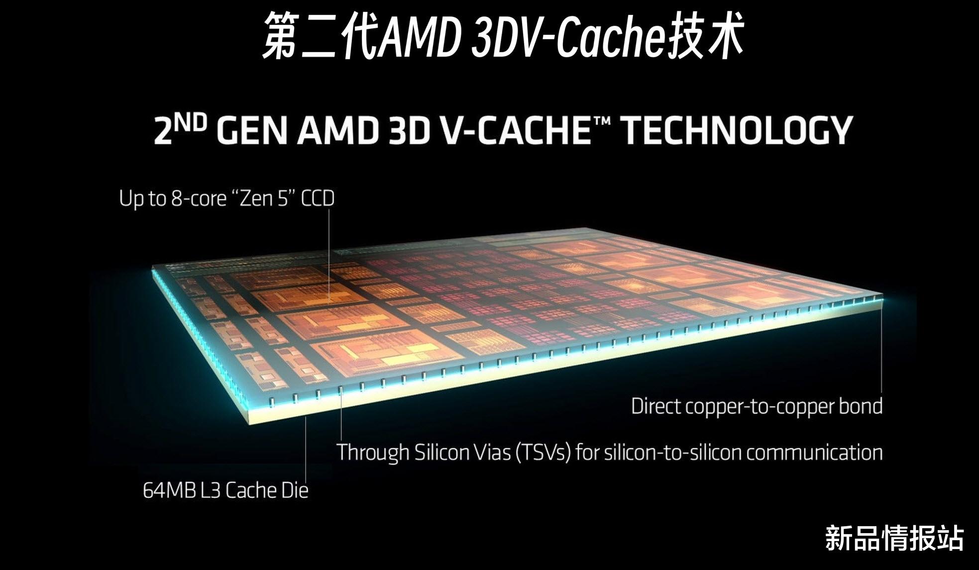 第二代3DV-Cache的技术突破相较于初代3DV-Cache的“覆盖式”堆叠,9950X3D的64MB缓存层采用“基座式”设计,直接置于CCD核心下方。这种物理布局优化带来三重优势:首先,缩短数据传输路径,延迟降低约15%;其次,通过芯片顶盖直接接触运算核心,散热效率提升20%,有效缓解了前代产品的积热问题;最后,结合AMD的智能功耗管理技术,处理器可根据负载动态分配资源,游戏进程优先调用大缓存CCD,生产力任务则调度至高频率CCD,实现性能与能效的双重平衡。