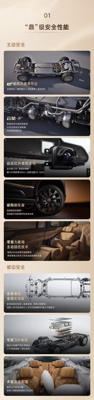 这款车官方给了个slogan是“为豪华注入鼎级安全”,最夸张的一个数据是它100%全铝的,关键部分采用7系列铝材,这在目前全球的产品里应该也算是“绝无仅有”。这可是一个5米4的大块头啊,用全铝一方面可以减重,另一方面通过一体式低压铸造与挤压成型工艺,前、中、后三段分段设计,使大车架全方位碰撞防护能力大幅提升。云辇-P+ 应该算是首发,比亚迪云辇的作用就不多介绍了,我个人比较关注的是,它的体验跟主动悬架相比到底如何?这个答案估计后续会有媒体测试出来,静等结果。后轮转向在这个级别(尺寸)的车上,那肯定得标配了,还有很多配置属于“肉埋在饭里”类型的,比如碳陶刹车盘,一般人注意不到,但这玩意性能就是比普通刹车盘强(当然也贵)。总之,128万起售的仰望U8L,配置上其实我们不用太关注,因为这个价位肯定能堆到顶的都堆到顶了。