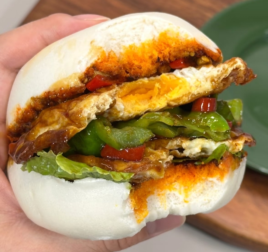 这道菜的灵感来自奶奶的饭桌。小时候总见她把剩馒头切片,夹上白糖或腐乳,变出让我雀跃的点心。后来在西安读书,被肉夹馍的醇厚征服;留学时啃着冷三明治,格外想念热乎的中式味道。直到某个加班夜,灵光乍现把馒头煎得金黄,夹进冰箱里的剩菜,那一刻突然明白:美食从来不是规矩的囚徒,而是记忆的载体。