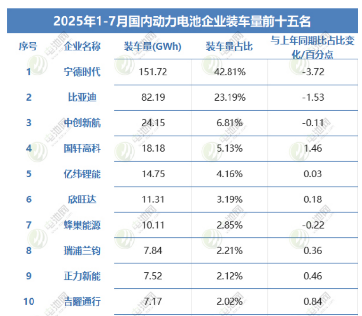 2024年宁德时代、比亚迪吃下动力电池七成的市场份额,亿纬锂能在全球的市占率仅为2.8%。今年前7个月,中国汽车动力电池产业创新联盟数据显示,宁德时代、比亚迪的市占率合计达65%。亿纬锂能的市占率仅为4.16%。