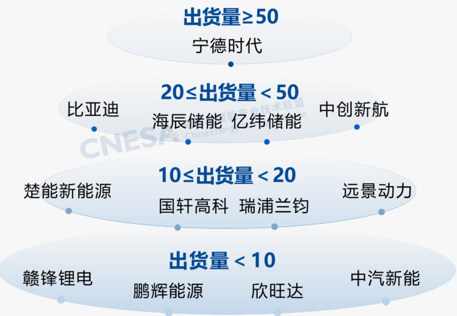 今年上半年,与动力电池的市场竞况如出一辙,储能领域的市场竞争也尤为惨烈。两大龙头份额缩减,腰部以上厂商集体上攻: