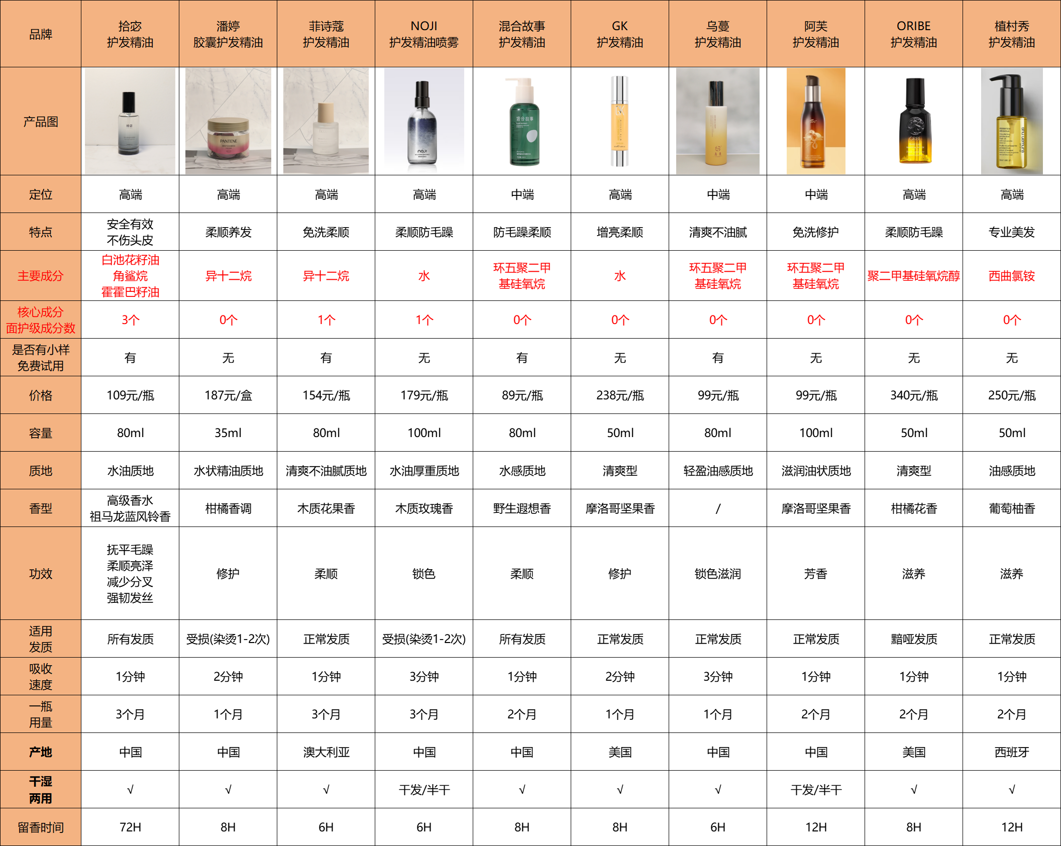 每次想换新精油,我都会习惯性先翻表格,你懂的吧,就是图个安心。下面就是这次参与测评的几款精油的数据合集,参数清清爽爽列好啦。