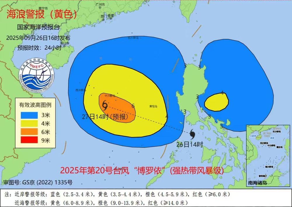 海浪方面,受今年第20号台风“博罗依”的影响,预计9月26日夜间到27日下午,南海中部将出现4到6米的巨浪到狂浪区,近海海域海浪预警级别为黄色。请在上述海域作业的船只注意安全,沿海各有关单位提前采取防浪避浪措施。
