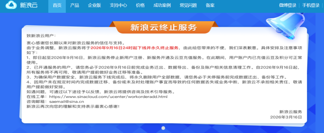 日前,新浪云(Sina Cloud)官方正式宣布将于2026年9月16日永久终止服务。