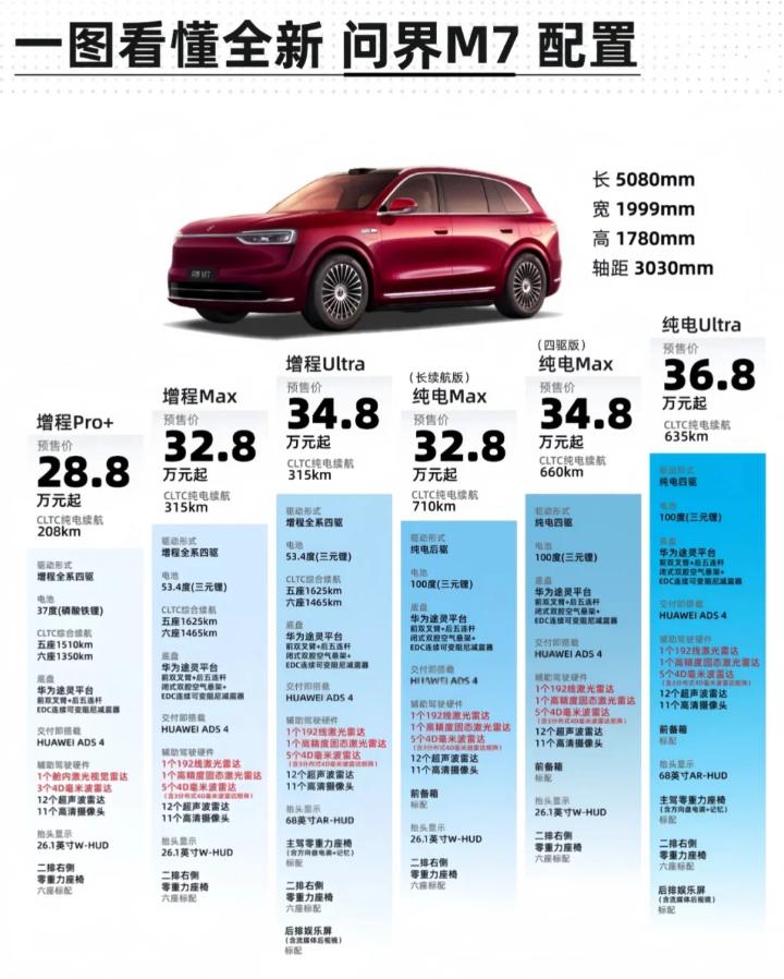 全新问界M7正式上市,售价区间27.98万-37.98万元,共发布6十二款车型!其中增程版有六款车型可选,售价区间为27.98万-35.98万元;纯电版售价区间为31.98万-37.98万元。