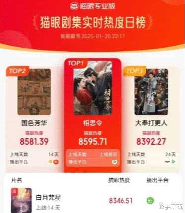 《相思令》首播当日,热度迅速攀升至猫眼榜单第六位,多个相关话题登上热搜榜。