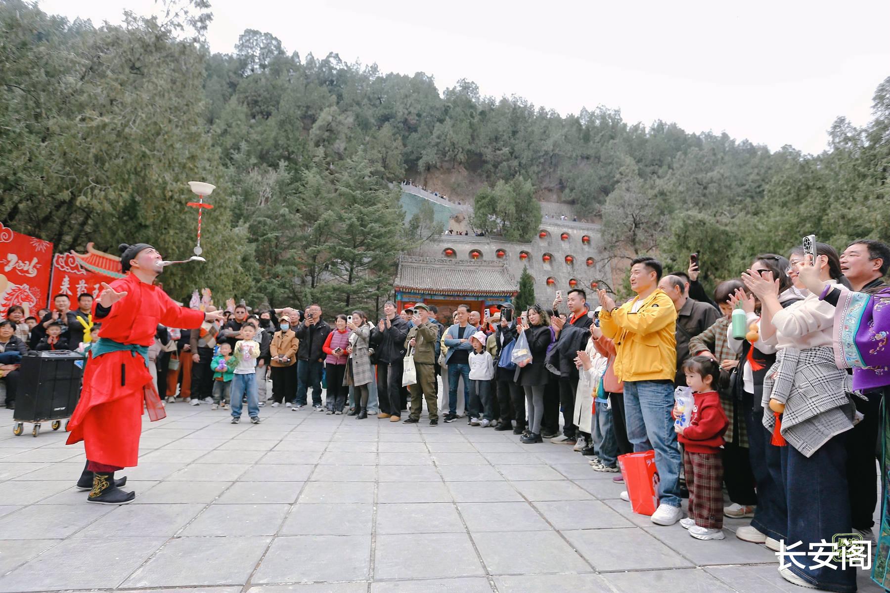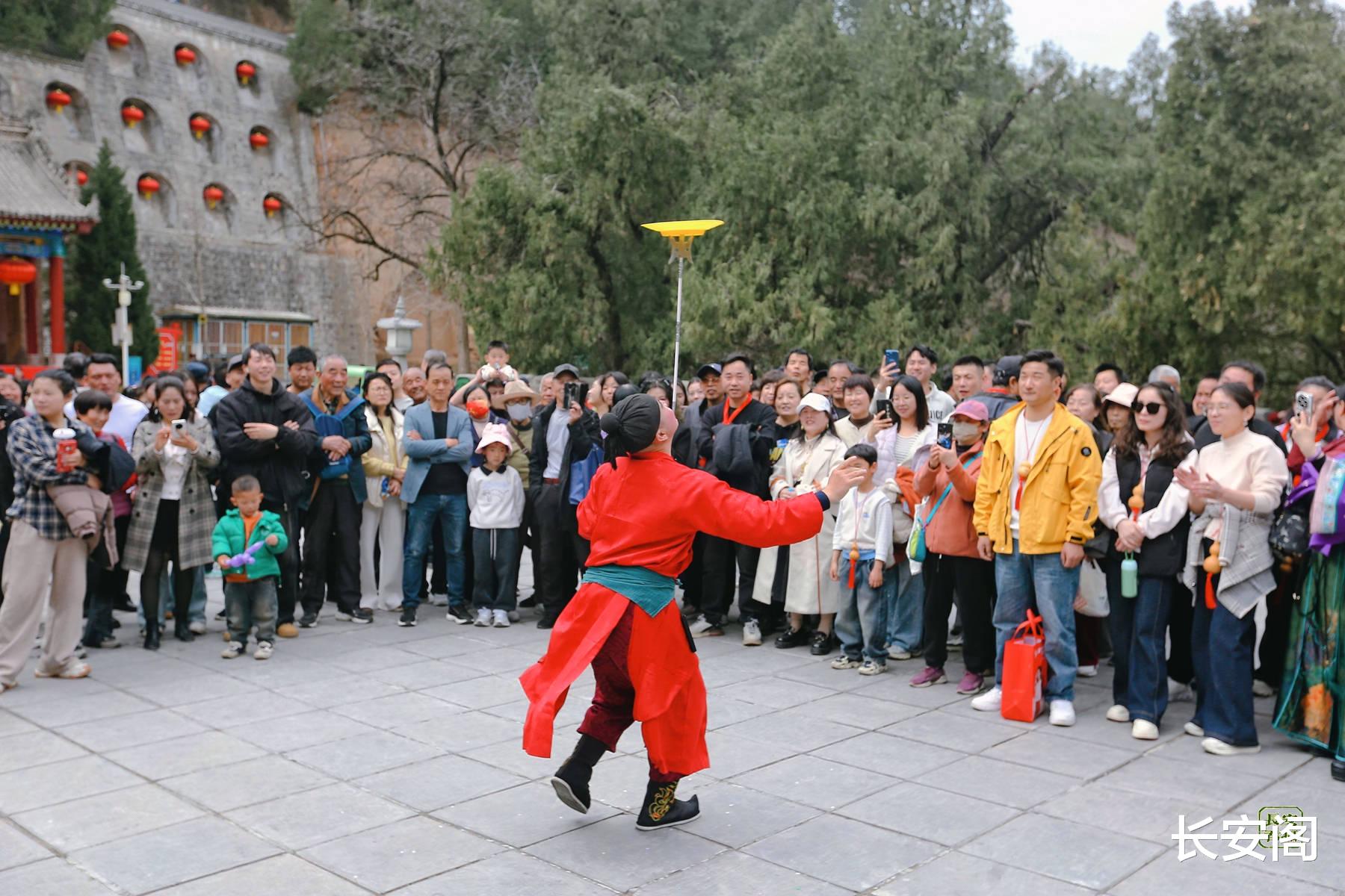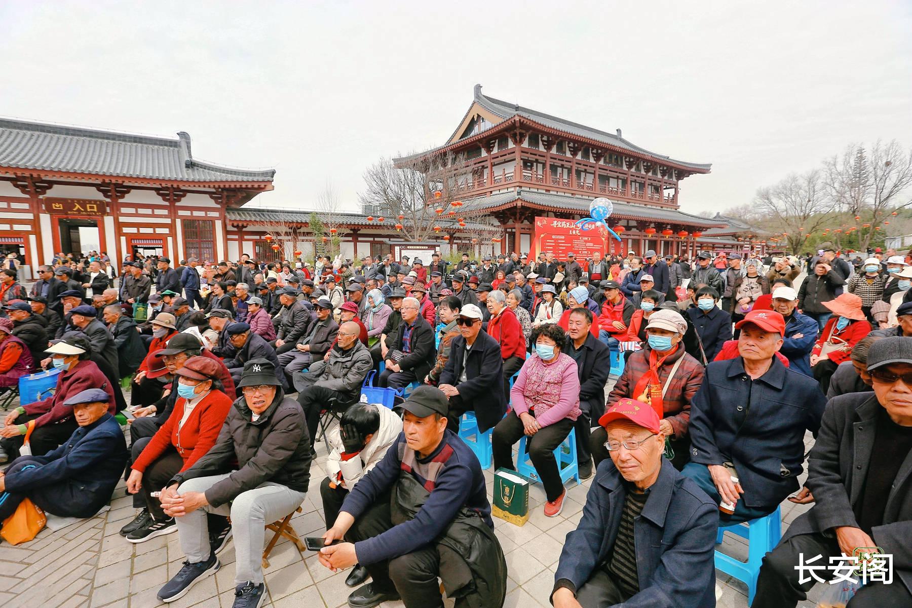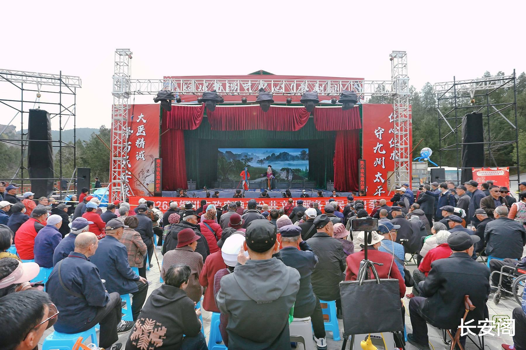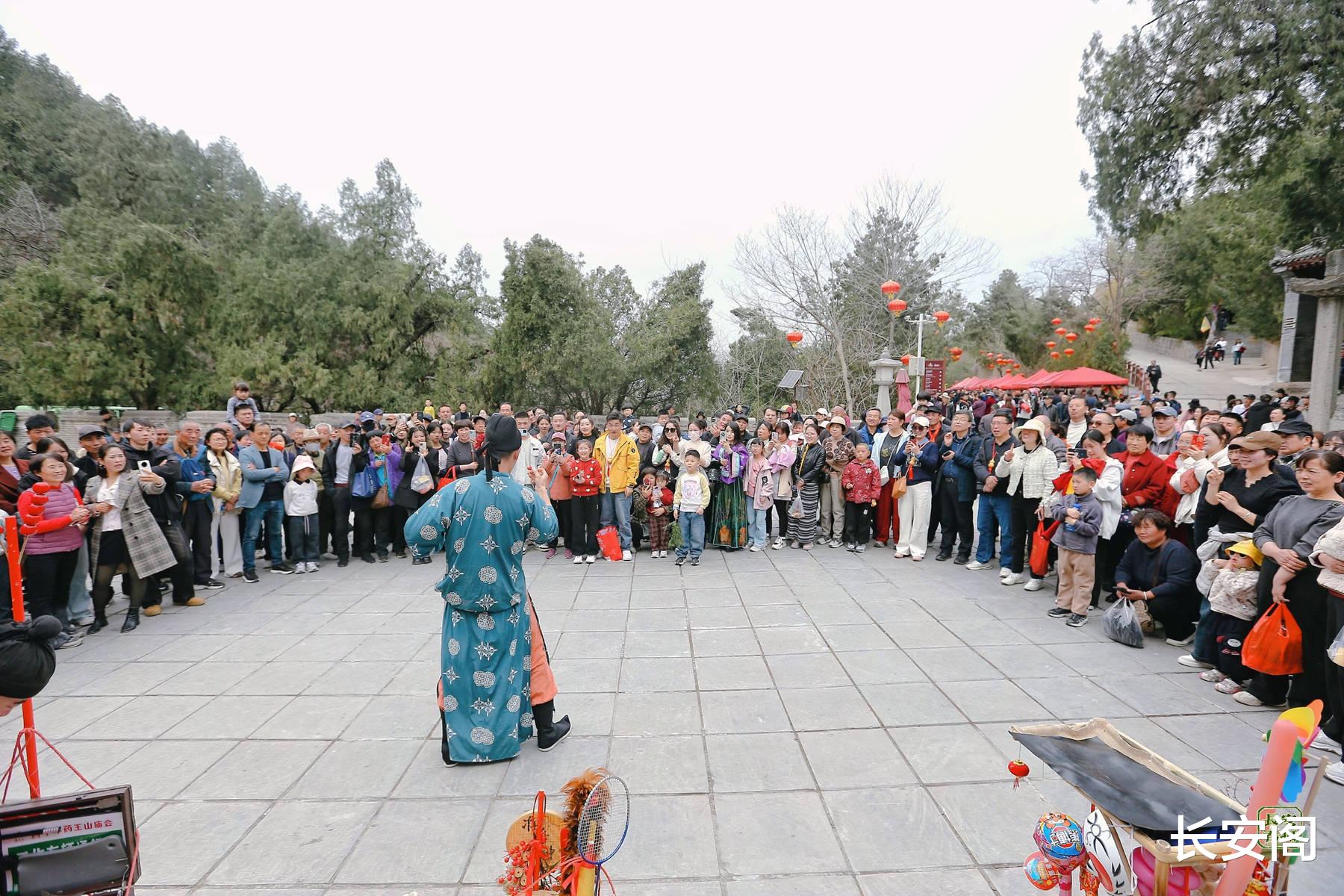 药王山景区门口的戏台,秦腔经典剧目轮番上演,铿锵的锣鼓、高亢的唱腔引得台下掌声不断;